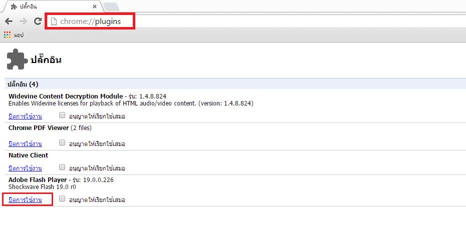 สำหรับเบราว์เซอร์ Google Chrome : ให้เปิด เบราว์เซอร์ Chrome ขึ้นมา แล้วพิมพ์ว่า chrome://plugins ลงไปในช่อง URL จากนั้นกดปุ่ม Enter แล้วจะมีการแสดงรายการของ ปลั๊กอิน ทั้งหมดขึ้นมา ให้หาปลั๊กอินที่ชื่อ Adobe Flash Player แล้วกดปุ่ม ปิดการใช้งาน