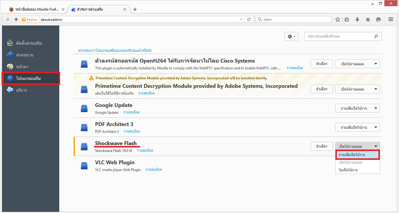จากนั้นไปที่ โปรแกรมเสริม (Plugins) แล้วหารายการที่ชื่อว่า Shockwave Flash จากนั้นให้ทำการเลือก ถามเพื่อเปิดการใช้งาน (Ask to Activate) หรือจะเลือกเป็น ไม่เปิดใช้งาน (Never Activate) เลยก็ได้เช่นกันครับ