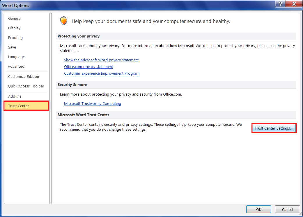 จากนั้นจะมีหน้าต่าง Options ขึ้นมา ให้เลือกที่หัวข้อ Trust Center แล้วกดที่ปุ่ม Trust Center Settings...