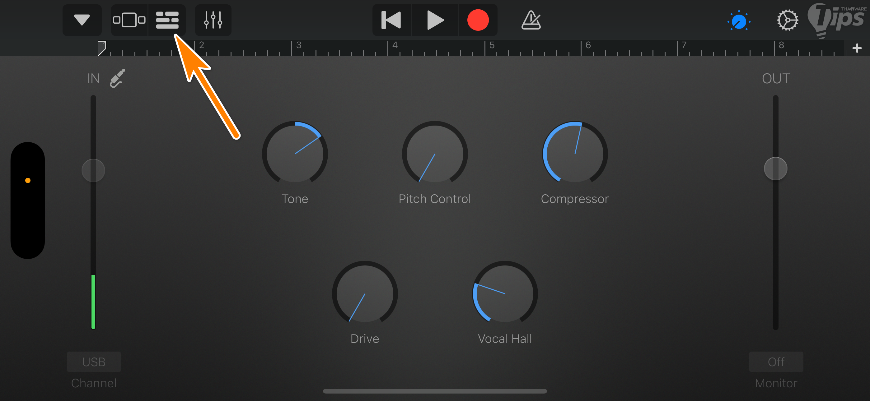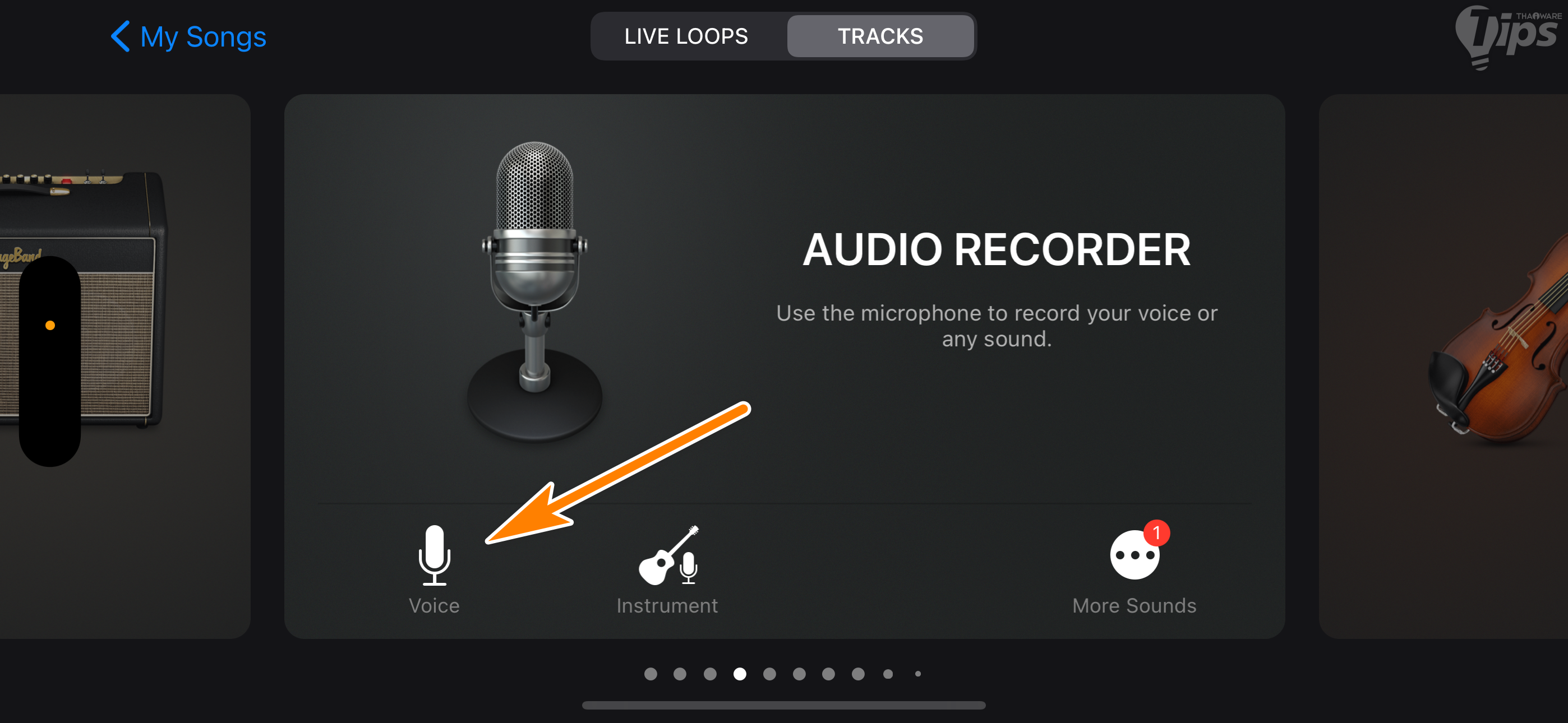 1. หลังจากที่เราได้ดาวน์โหลดแอป GarageBand มาติดตั้งลงบน iPhone เป็นที่เรียบร้อยแล้ว ให้เราเปิดแอปพลิเคชันขึ้นมา เลื่อนไปที่หน้า "เมนู AUDIO RECORDER" แล้วแตะที่ "เมนู Voice"