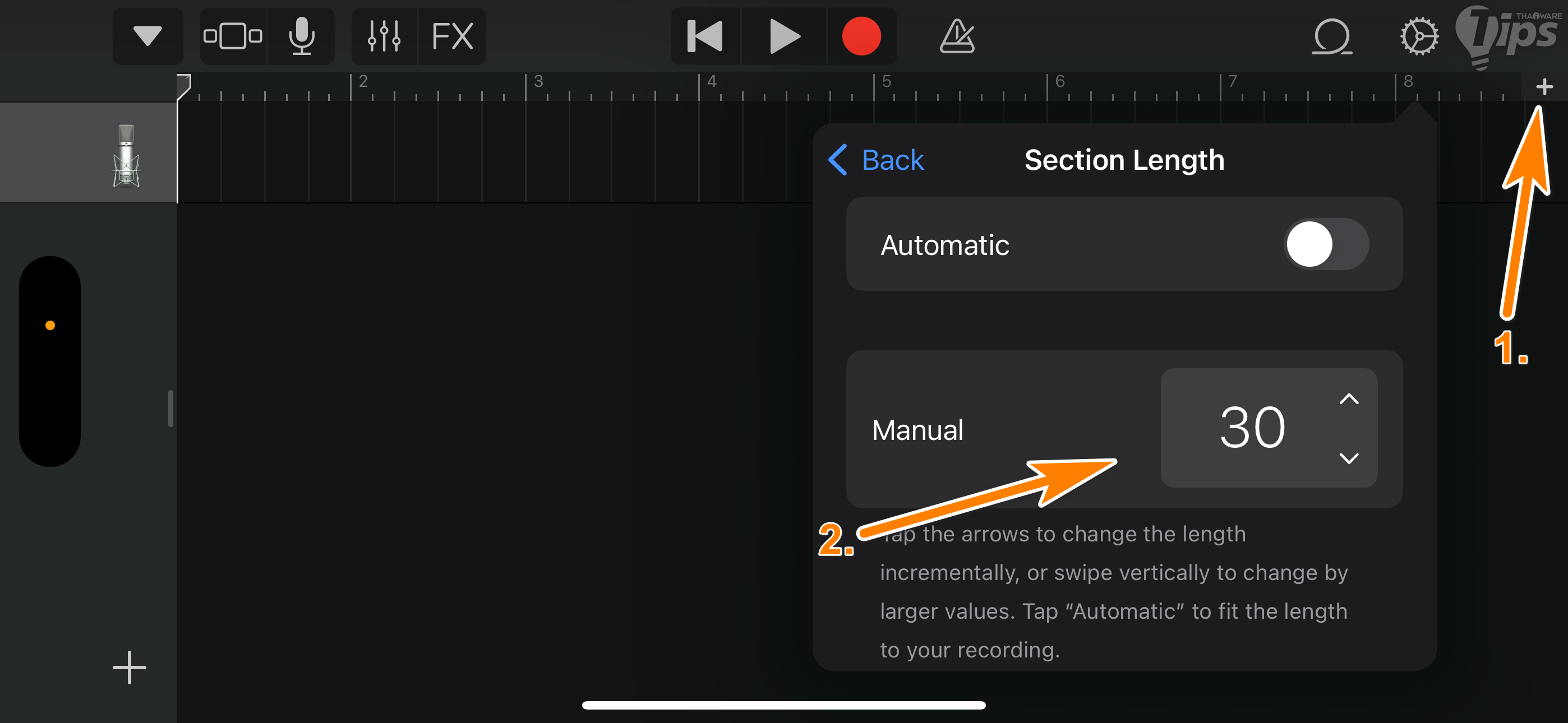 1. ในหน้ามุมมองแทร็ค ให้เราปรับความยาวของแทร็คให้เท่ากับความยาวของริงโทนเสียก่อน โดยแตะที่ "เมนู +" จากนั้นในช่อง Manual ให้ปรับเป็น "30"