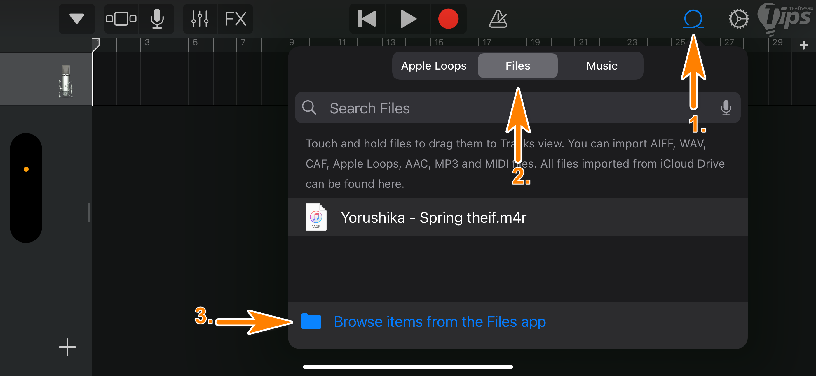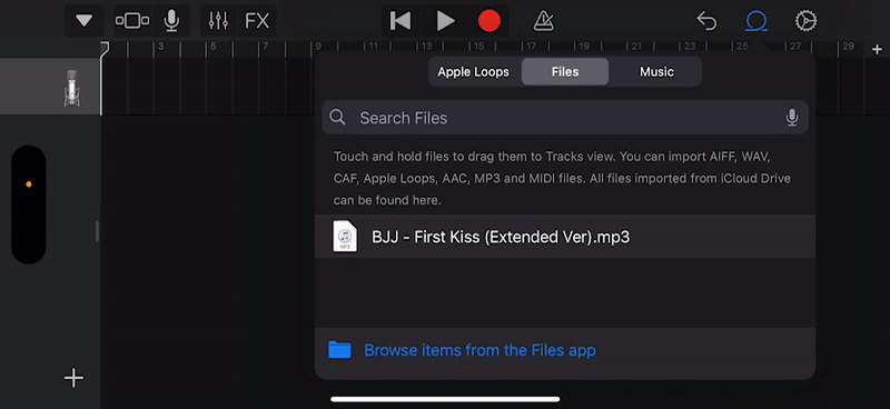 1. จากนั้นแตะที่ "เมนู Loop" เราจะเข้ามาสู่หน้าจอเลือกเพลงซึ่งก็จะมีอยู่ 3 แหล่ง ที่เราสามารถดึงเพลงเข้ามาได้นั่นก็คือจาก Apple Loops, Files และ Music นั่นเอง