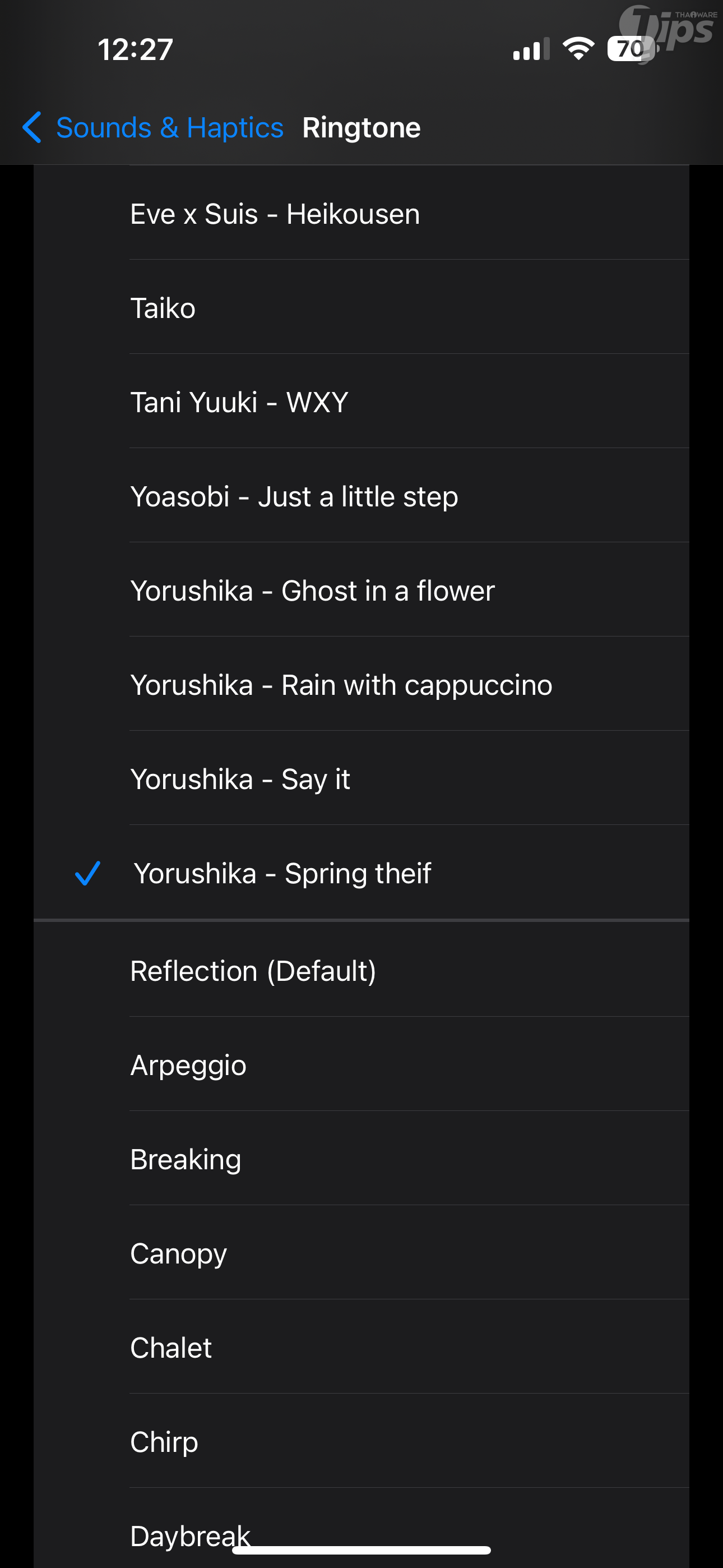เท่านี้เพลงดังกล่าวก็จะกลายเป็นริงโทนเรียบร้อย สามารถเข้าไปตรวจสอบ หรือตั้งเสียงริงโทนได้ด้วยการเข้าไปที่แอป Settings ใน "เมนู Sound & Haptics " ตามด้วย Ringtone จะเห็นว่ามีริงโทนที่เราทำถูกเพิ่มเข้ามาให้เลือกใช้งานแล้ว