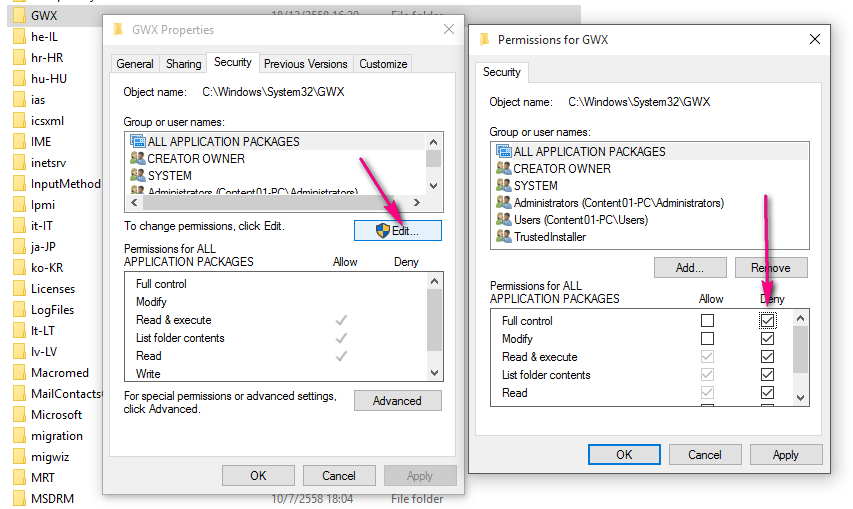 ทำการคลิกขวาที่โฟลเดอร์ GWX เลือก Properties ไปที่แท็บ Security กด Edit ที่ Permissions