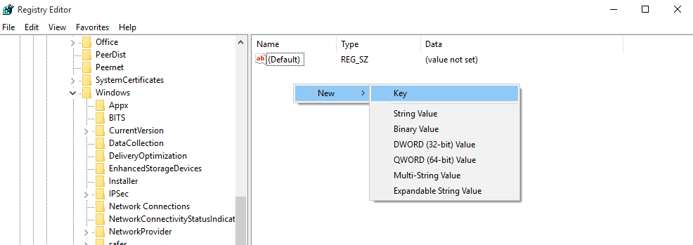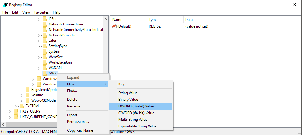 ไปที่ HKEY_LOCAL_MACHINE\SOFTWARE\Policies\Microsoft\Windows คลิกขวาเลือก New > Key ตั้งชื่อว่า GWX