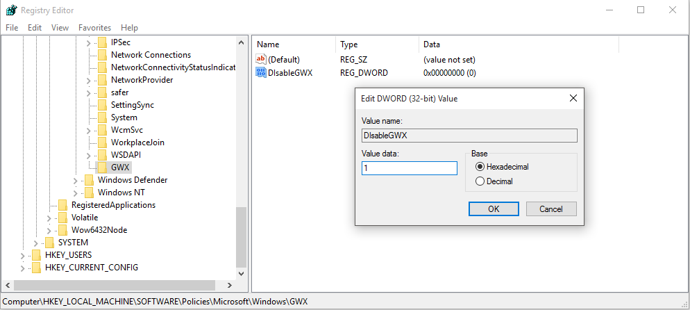 ตั้งชือ่รีจิสทรีใหม่ว่า DisableGWX แล้ว คลิกที่ไฟล์ดังกล่าว ตั้งค่า Value data ให้เป็น 1 กด OK