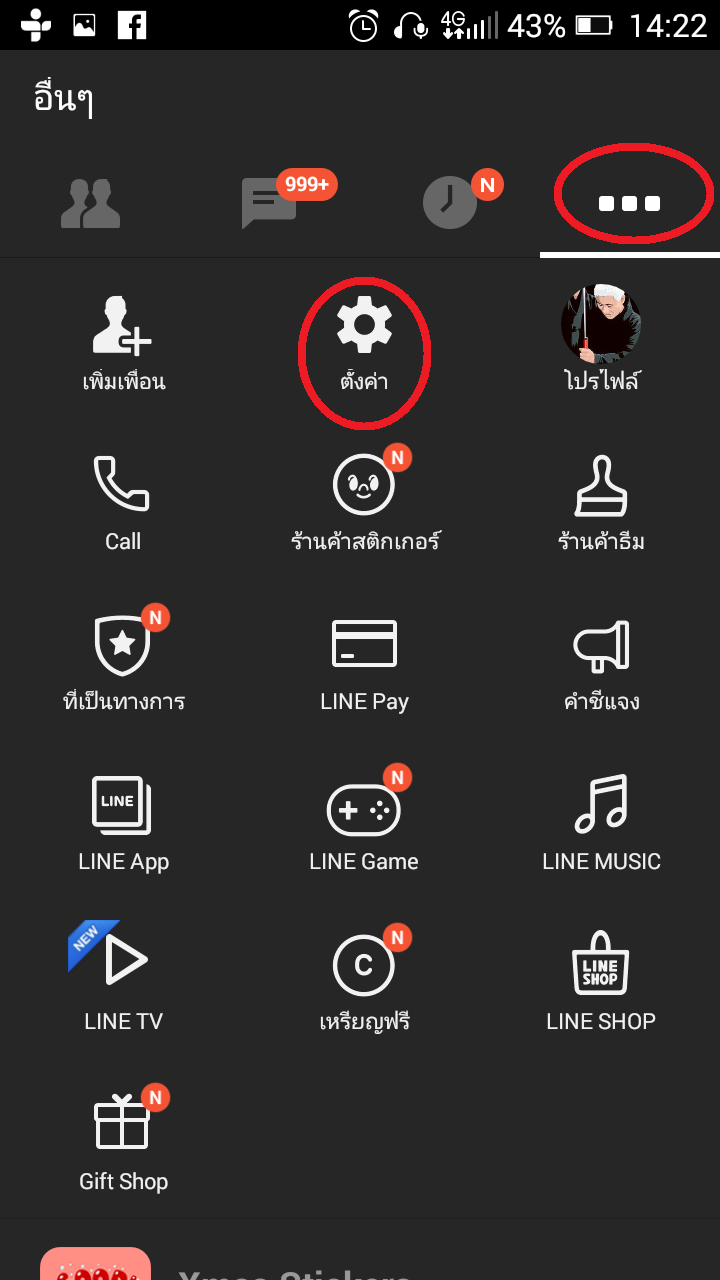 วิธีการเอา Emoji กลับมาให้แตะที่แถบเมนู More ของแอปฯ Line (ปุ่ม 3 จุดตรงมุมซ้ายบนของหน้าจอ) จากนั้นแตะที่ปุ่ม ตั้งค่า (รูปฟันเฟือง) แอปฯ ก็จะพามายังหน้าจอในรูปทางด้านขวา ให้แตะที่ แชท . โทร ตามภาพ