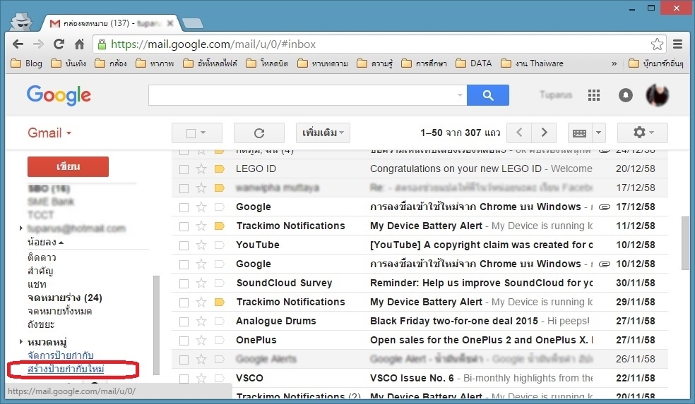 ลำดับต่อมา เราจะกำหนดชื่อป้ายกำกับให้กับชื่อบริษัทของลูกค้า หรือกำหนดชื่อป้ายกำกับสำหรับกิจกรรมใดๆ ที่เราให้ความสำคัญ และต้องการให้ค้นหาอีเมลทั้งหมดที่เกี่ยวกับเรื่องนั้นได้ง่ายๆ ในตัวอย่างนี้เราจะสร้างป้ายกำกับให้กับอีเมลที่เกี่ยวกับเรื่อง สมัครเรียนต่อ ในช่อง กรุณาป้อนชื่อป้ายกำกับใหม่ ให้ใส่ชื่อป้ายกำกับว่า "สมัครเรียนต่อ" แล้วคลิกที่ปุ่ม สร้าง
