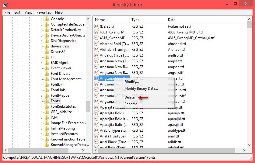 ทีนี้เราก็จะเจอรายชื่อของฟอนต์ต่างๆ มากมาย สามารถเลือกลบได้ตามต้องการ แต่ถ้าเราจะลบไฟล์ใน Registry ควรจะ Backup ข้อมูลไว้ก่อน