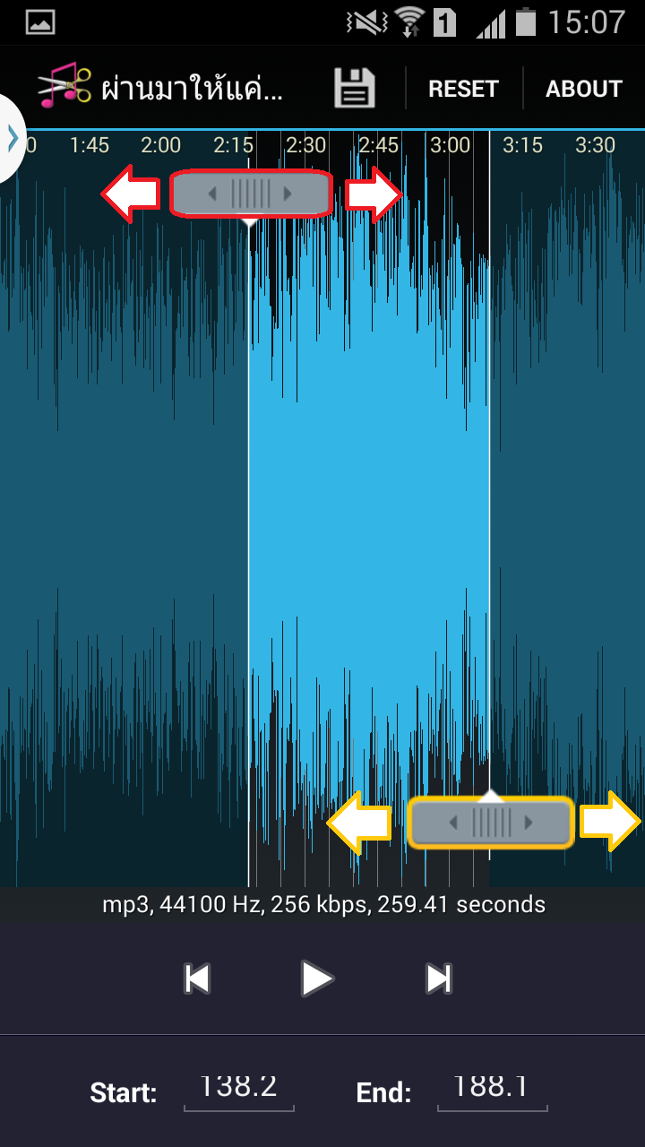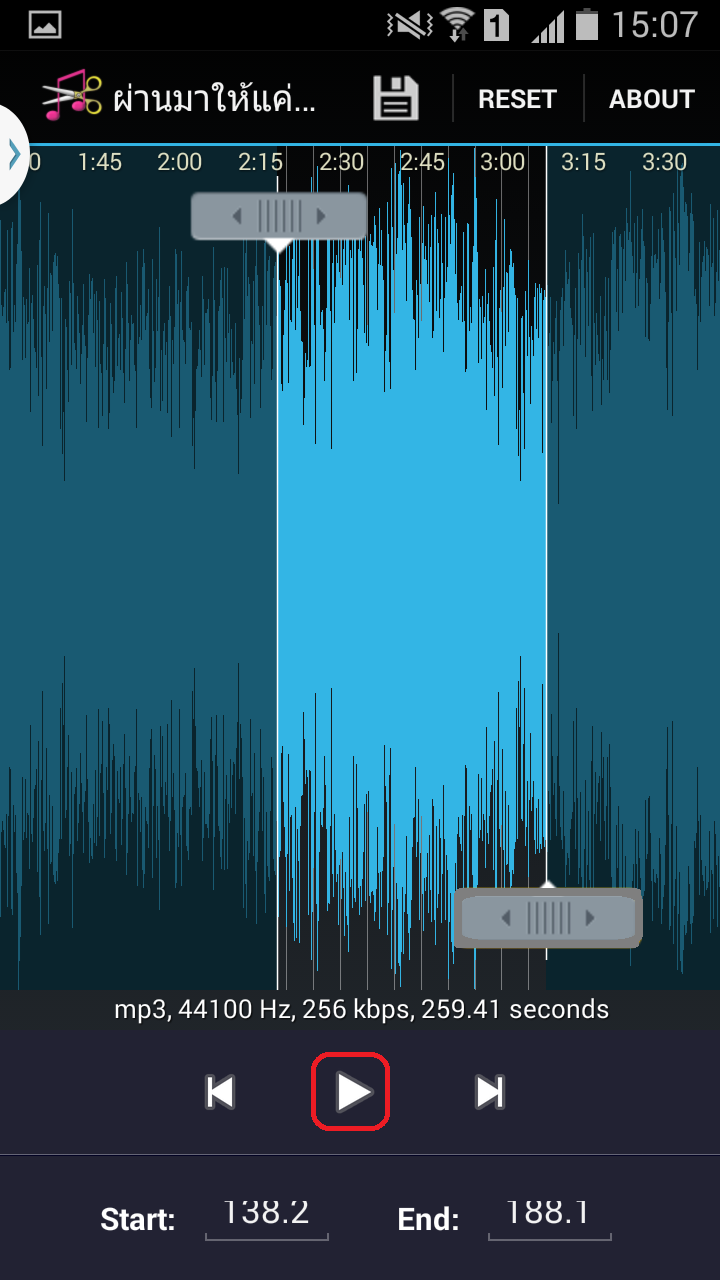 หลังจากกดเลือกเพลงเข้ามาแล้ว จะพบกับหน้าต่างๆ ที่เป็นไทม์ไลน์ของคลื่นเสียง ในหน้าต่างนี้เราสามารถกดทดลองฟังเสียงที่ ปุ่ม Play บริเวณด้านล่าง พร้อมทั้งสามารถเลื่อน แท็บด้านบน และ แท็บด้านล่าง ที่อยู่บนไทม์ไลน์ เพื่อกำหนดช่วงเวลาของจุดเริ่มต้น และจุดสิ้นสุดของริงโทนที่เราต้องการได้