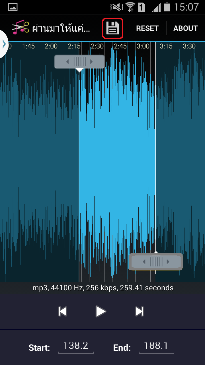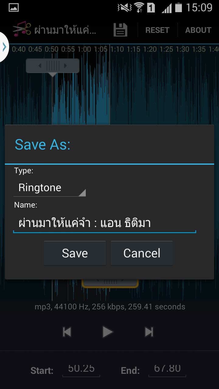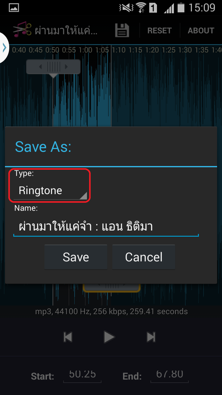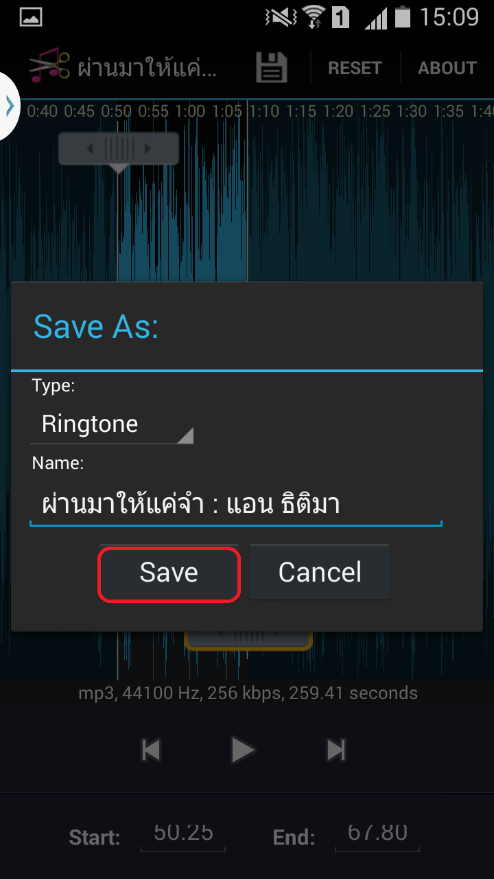 เมื่อกำหนดช่วงเวลาหรือท่อนเพลงที่ต้องการจะนำมาทำริงโทนได้แล้ว ให้กดที่ ปุ่ม Save (สัญลักษณ์รูปแผ่นดิสก์) ที่ด้านบน จากนั้นแอปฯ จะขึ้น หน้าต่าง Save As: ขึ้นมา