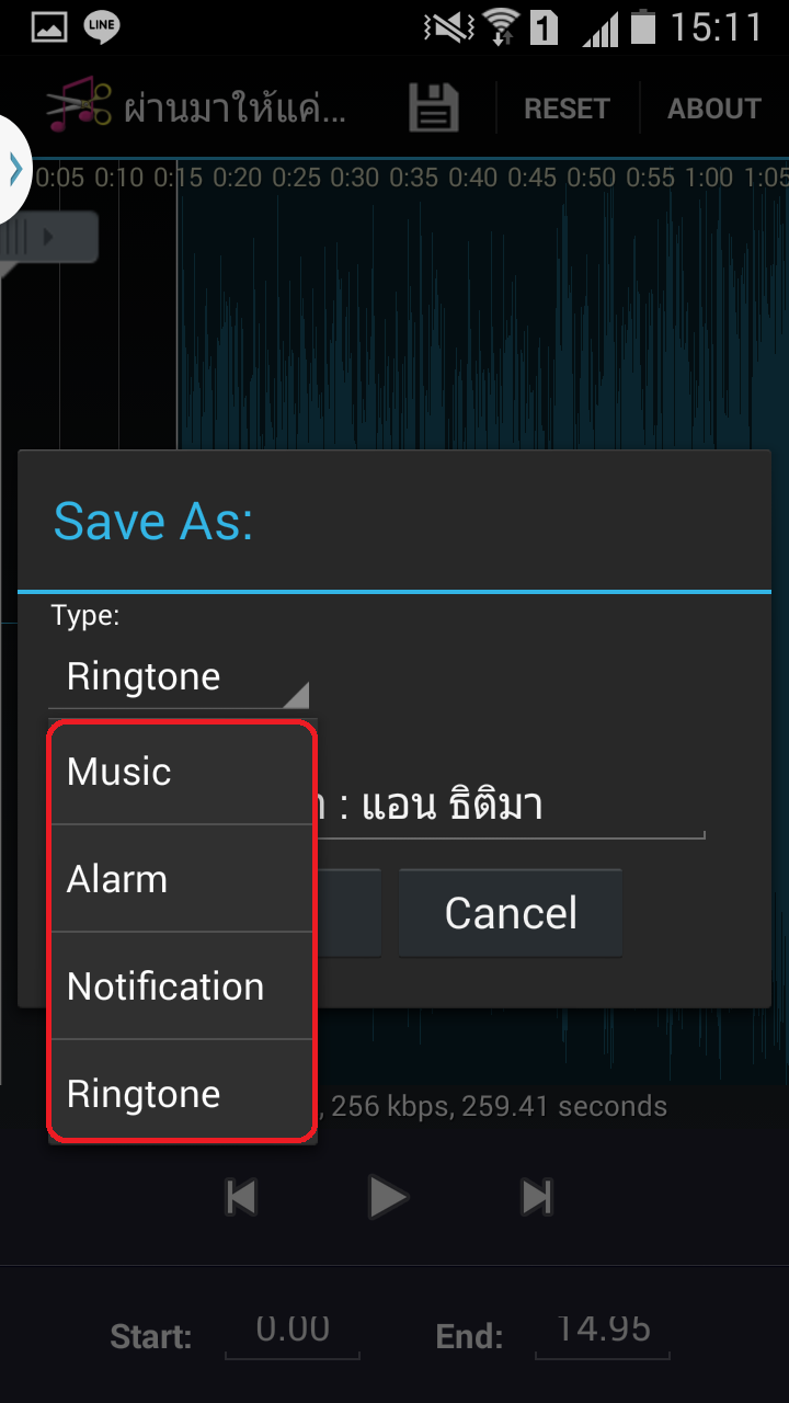 ใน หน้าต่าง Save As: จะมีฟังก์ชั่นพิเศษนิดหน่อยให้เราเลือก Type ได้ว่าต้องการนำไปใช้เป็น Ringtone หรือเสียงแจ้งเตือนอื่นๆ อย่าง Alarm และ Notification ได้