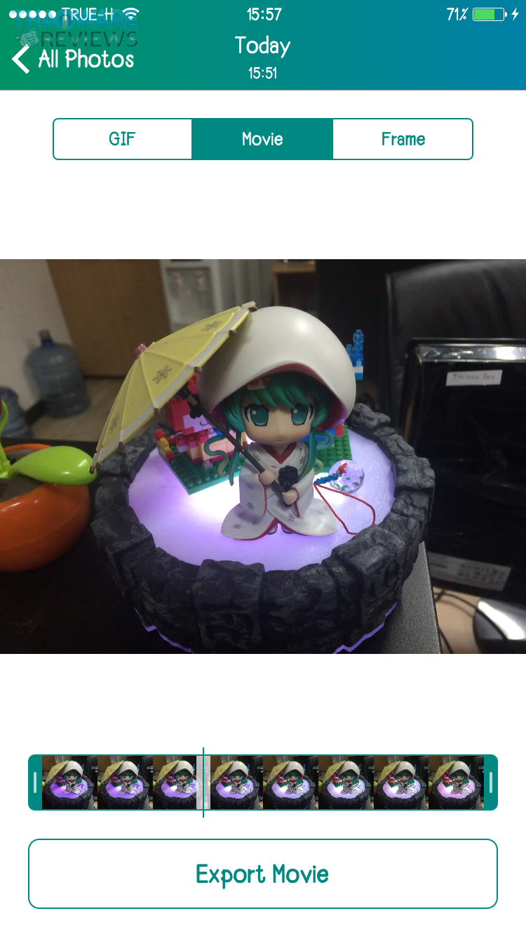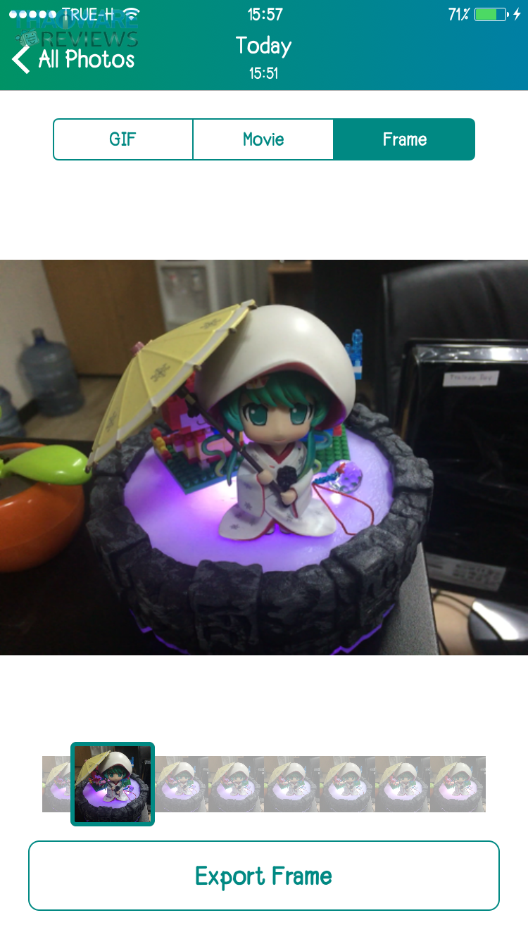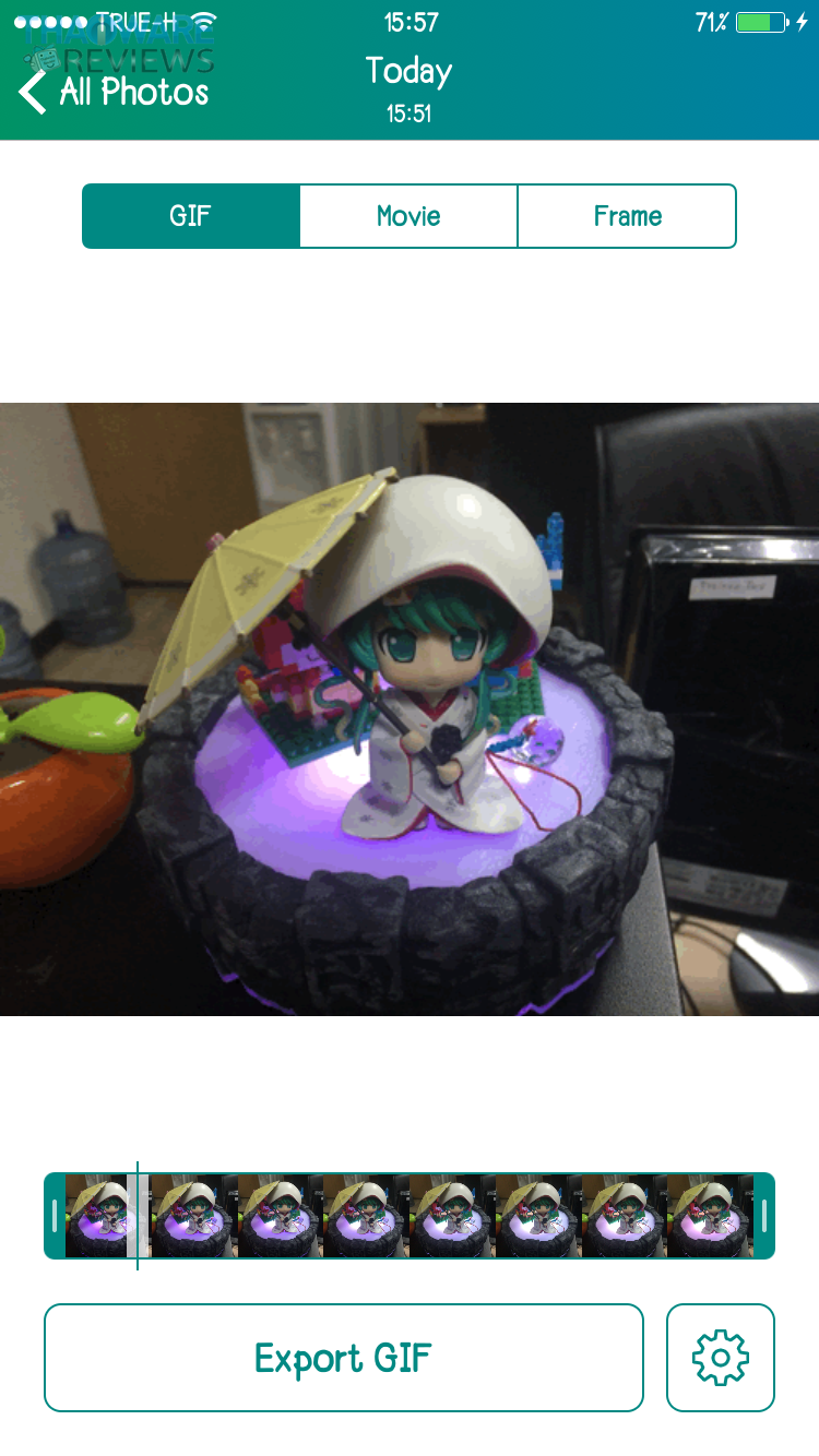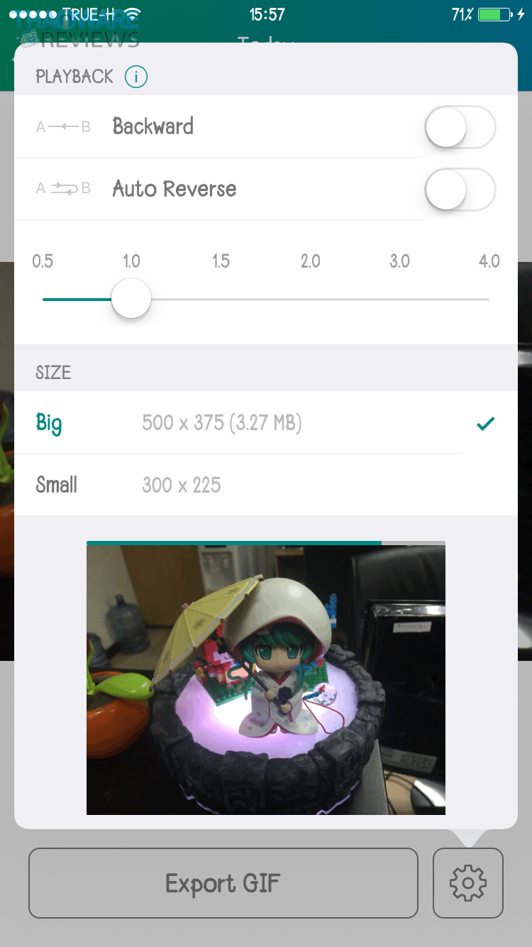 การแปลง GIF จะมีให้เราตั้งค่าได้ด้วยการแตะไปที่รูปเฟือง เราสามารถเลือกได้ว่าจะให้ภาพเล่นตามลำดับปกติ หรือสร้างความแปลกใหม่ด้วยการเล่นกลับหลัง ส่วนค่าตัวเลขที่เห็นด้านล่าง คือ ความเร็วในการเปลี่ยนเฟรมภาพ 1 คือ มาตรฐาน เลขยิ่งเยอะภาพยิ่งช้าครับ หากเรียบร้อยแล้วก็กด Export GIF ได้เลย