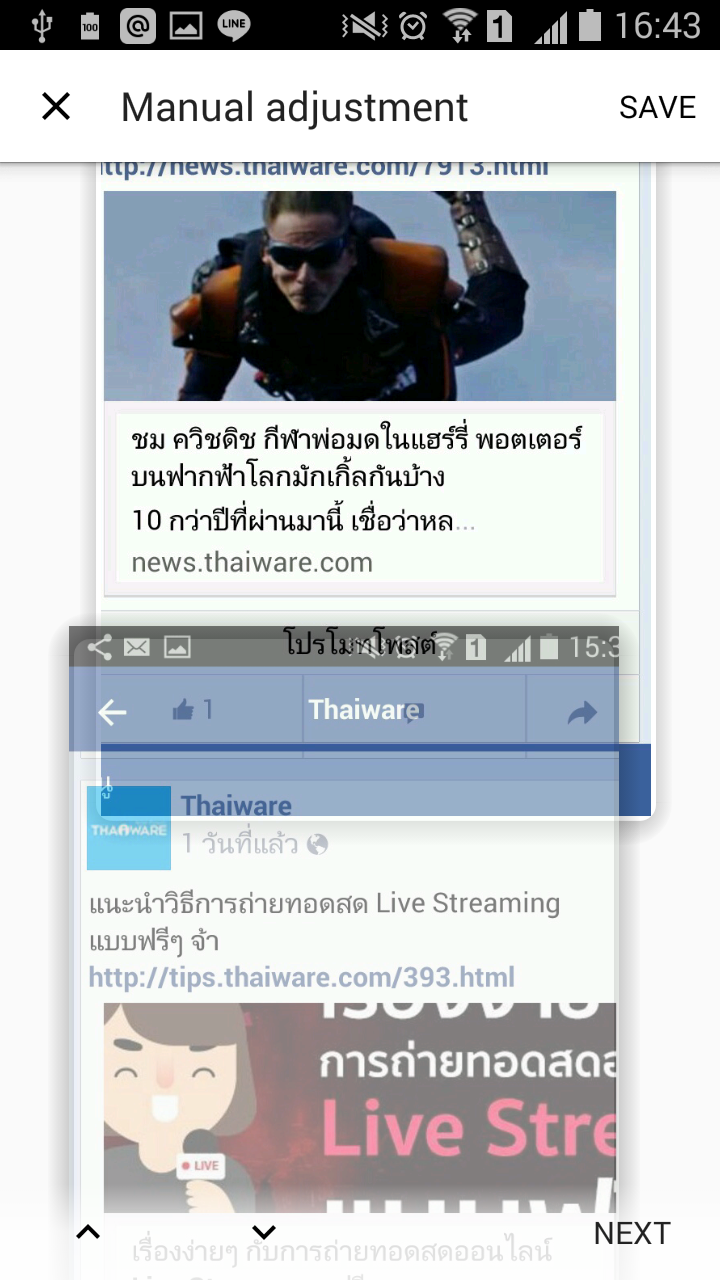 หลังจากกด NEXT มาแล้ว แอปจะขึ้นเครื่องมือสำหรับ Crop ภาพ เพื่อให้เราสามารถตัดในส่วนซ้อนกันของภาพที่ไม่ต้องการออกไป เมื่อตัดภาพได้ในตำแหน่งที่พอดีแล้ว ก็สามารถกด ปุ่ม SAVE ได้เลย