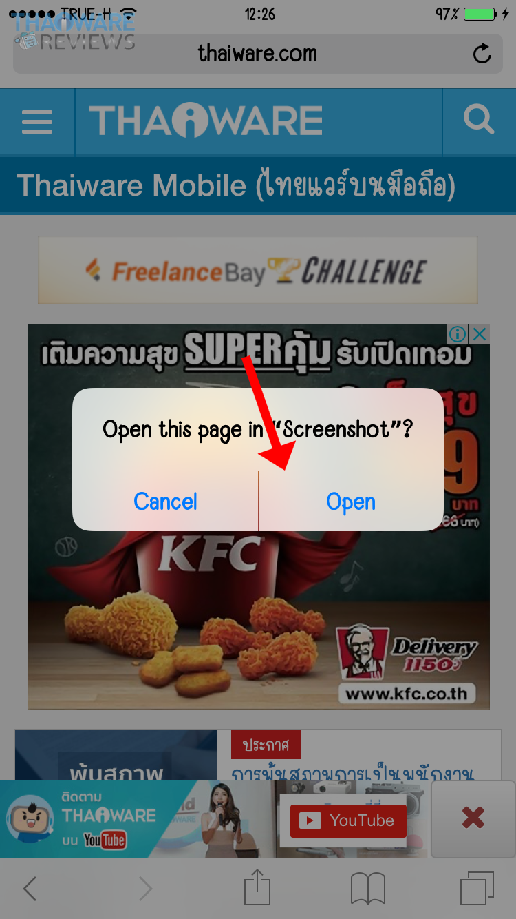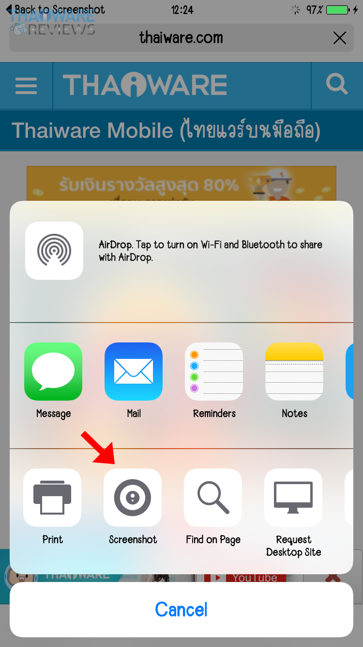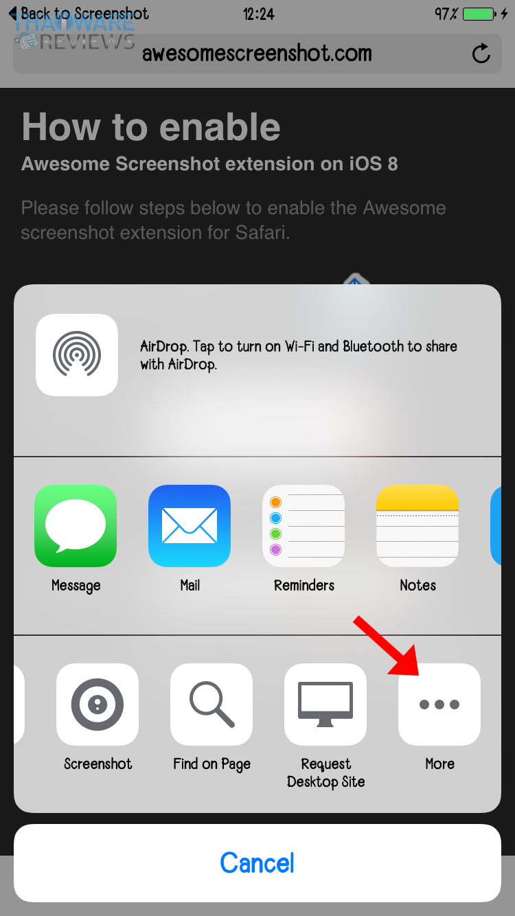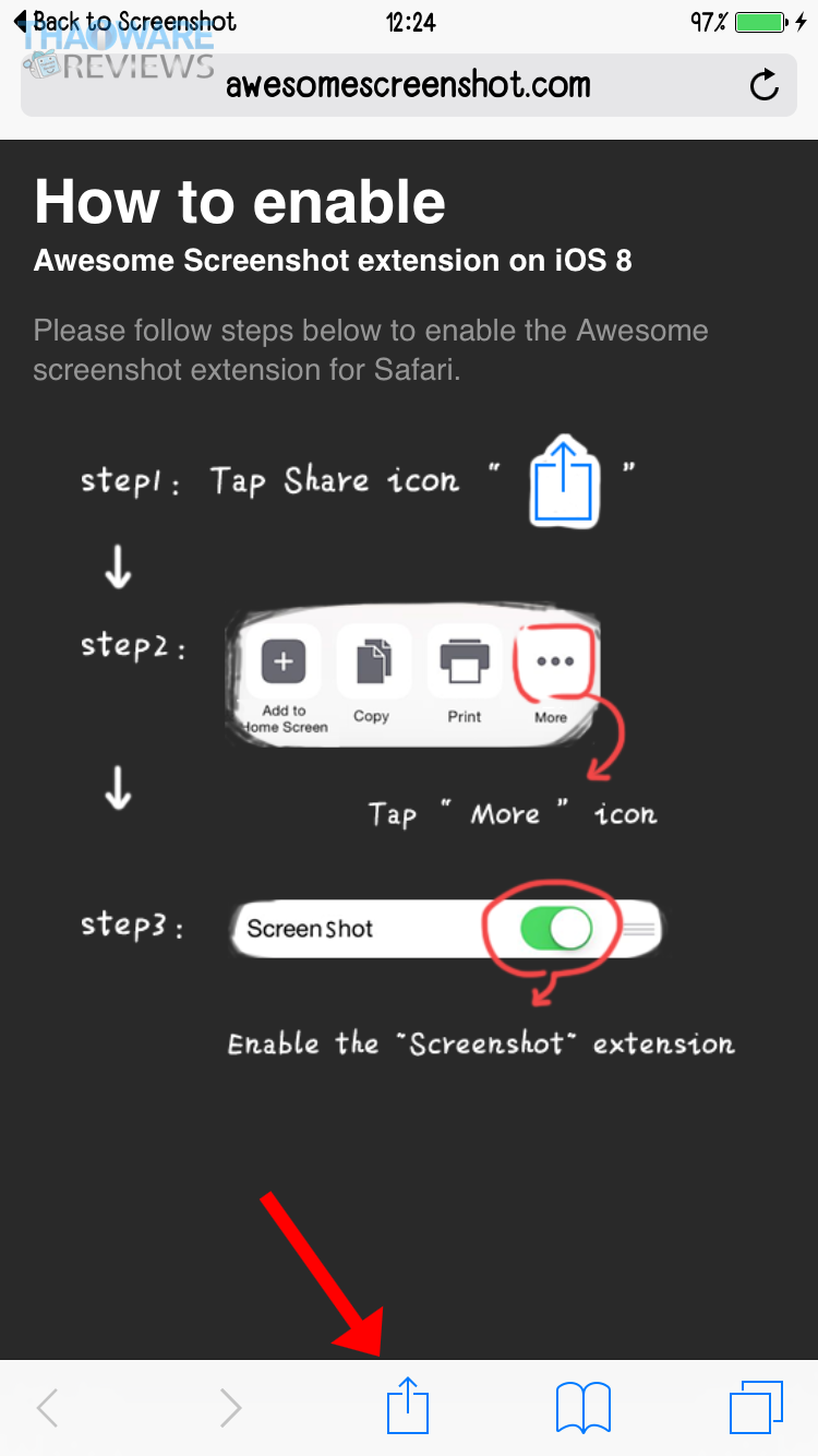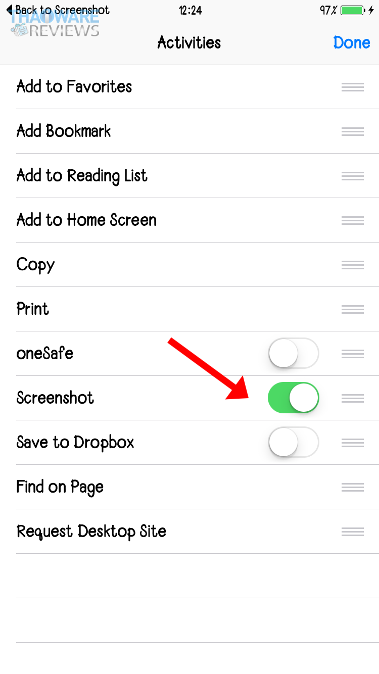การเปิดใช้งานให้เราเปิด Safari ขึ้นมาแล้ว แตะรูปลูกศรขึ้น เลื่อนไปยัง More กดเปิดใช้งาน Screenshot