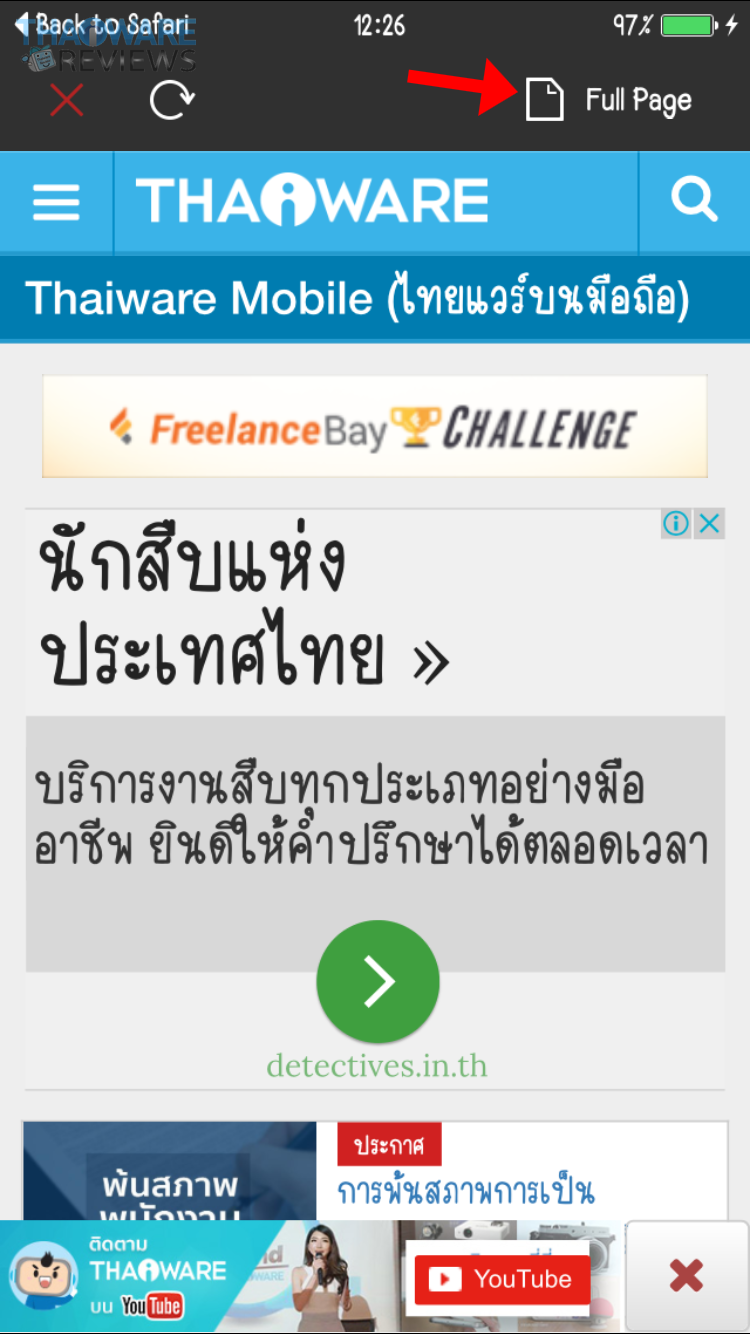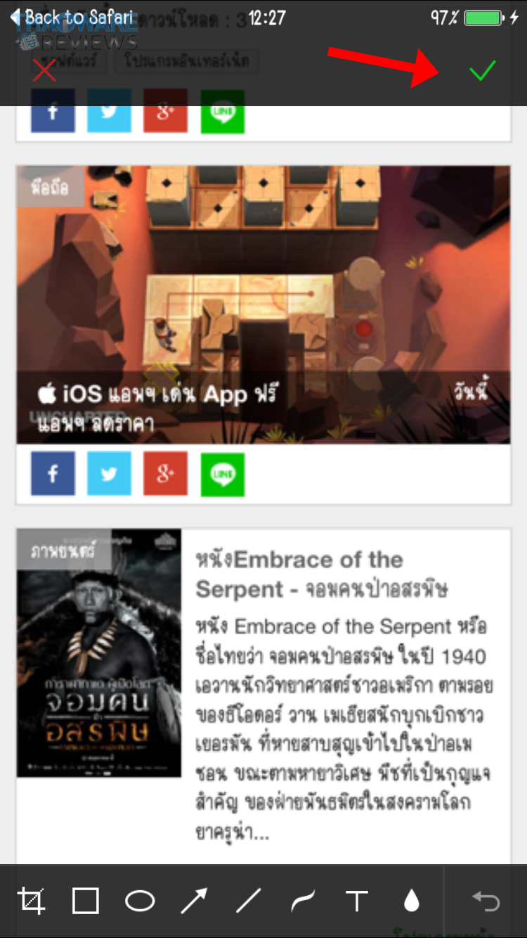 เมื่อแอปฯ เปิดขึ้นมาแล้ว จิ้มไปที่ Full Page ตรงด้านขวาบน เราจะเห็ฯว่าด้านล่างมีแถบเครื่องมืออยู่ เราสามารถไฮไลต์ หรือเติมข้อความในภาพได้จากตรงนี้เลย หากจัดการเรียบร้อยแล้วแตะไปที่เครื่องหมายถูกด้านขวาบน เพื่อบันทึกภาพครับ