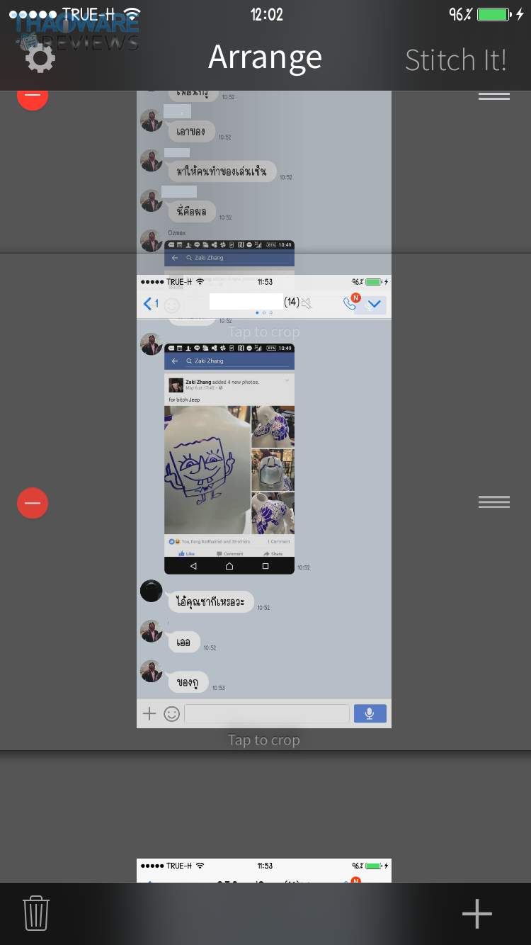 เรียงภาพตามลำดับที่ต้องการให้เรียบร้อย จากนั้นกดแตะที่รูป เราจะเห็นเส้นประ สำหรับ Crop รูป ให้ต่อกัน อันนี้ต้องกะดีๆ นิดนึง หากต้องการให้สวยงามต้องใจเย็น ค่อยๆ ขยับให้ภาพต่อกันเป๊ะๆ (เสียเวลาใช้ได้) เมื่อตัดต่อเสร็จแล้วให้แตะไปที่ปุ่ม Stitch It! ที่ด้านขวาบน