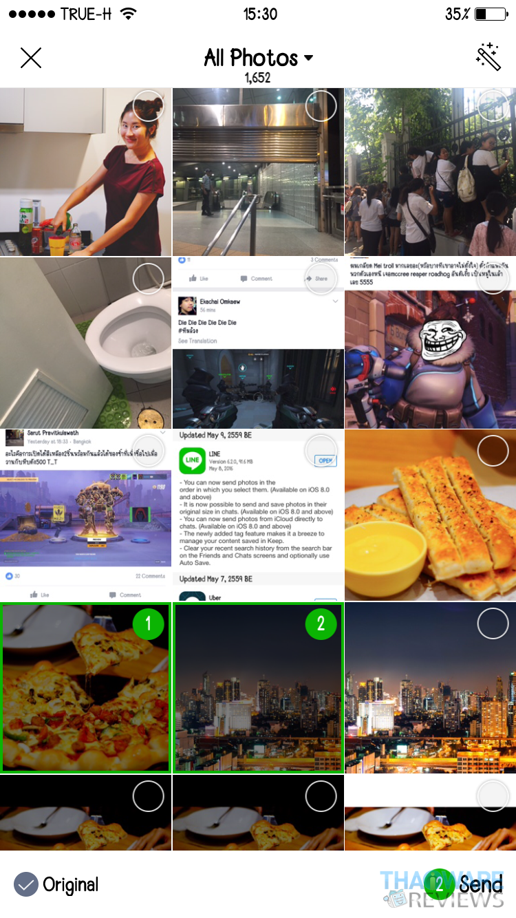 เทคนิค คือ เราต้องแตะที่วงกลมเล็กๆ ที่อยู่บริเวณมุมขวาบนของแต่ละภาพครับ จะแตะเลือกกี่ภาพก็ได้ เมื่อเลือกเสร็จดูตรงมุมซ้ายล่าง จะเห็นคำว่า Original อยู่ ให้เราแตะเพิ่มเครื่องหมายถูก แล้วค่อยกด Send เท่านี้ภาพที่ได้ก็จะไม่โดนย่อขนาดลงแล้วครับ