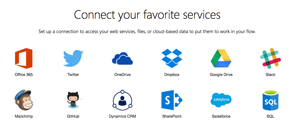 ข้อดีของ Microsoft Flow คือ ช่วยให้คุณเชื่อมโยงทุกบริการ Social Network, Online, Web สั่งให้เชื่อมโยง แลกเปลี่ยนข้อมูล แต่ละบริการสามารถพูดคุย สื่อสารกัน ทำงานแทนเรา จากภาพจะเห็นโลโก้บริการต่างๆ ที่เราคุ้นหน้าคุ้นตากันดี ที่บอกว่าสำหรับชาวออฟฟิศก็เพราะมี Slack, Saleforce, SQL, SharePoint ให้เชื่อมโยงได้ด้วย