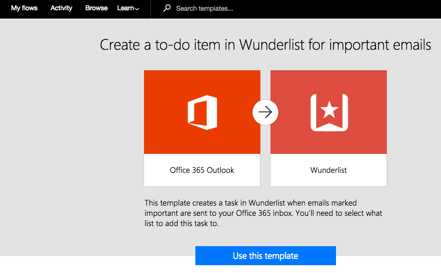 เลือกสร้าง Flow หรือเลือกจาก Template ก็ได้ ตัวอย่างในบทความนี้ เลือก Template สร้าง To-to list บน Wunderlist จากอีเมลสำคัญ กดที่ Use this template จากนั้นเชื่อมโยงบริการอีเมลและ Wunderlist เข้าด้วยกัน
