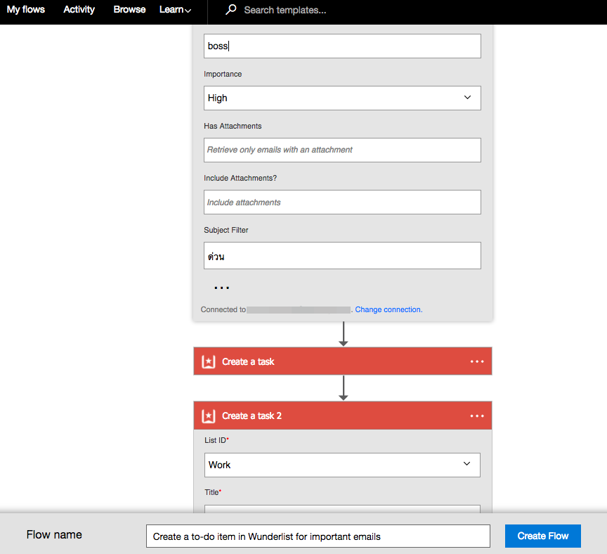 เมื่อมีข้อความอีเมลไหน ที่ตรงตามที่เรากำหนดเงื่อนไขไว้ อย่างเช่น อีเมลจากหัวหน้า, มีคำว่า Urgent, ด่วน ก็จะ Automated สร้าง Task บน Wunderlist ให้เราโดยอัตโนมัติ