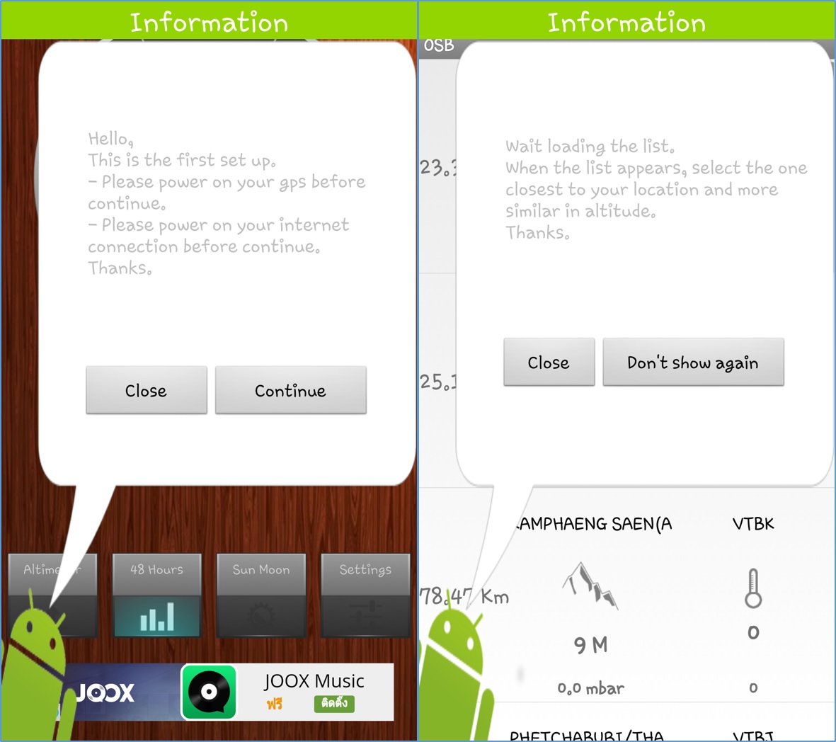 เมื่อติดตั้งแอป Barometer เรียบร้อยแล้ว พอเราเปิดแอปขึ้นมาครั้งแรก (ภาพซ้าย) แอปจะขอให้เราเปิดการทำงานของระบบ GPS และต้องเชื่อต่ออินเทอร์เน็ต จากนั้นแอปก็จะทำการดาวน์โหลดข้อมูลทางภูมิศาสตร์ของเมืองที่เราอยู่ (ภาพขวา)