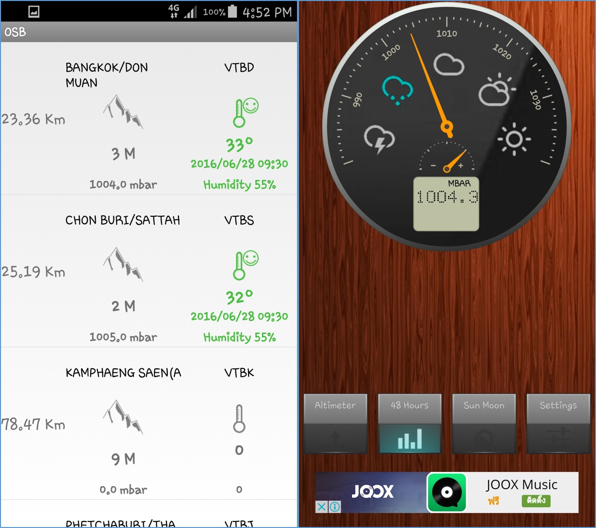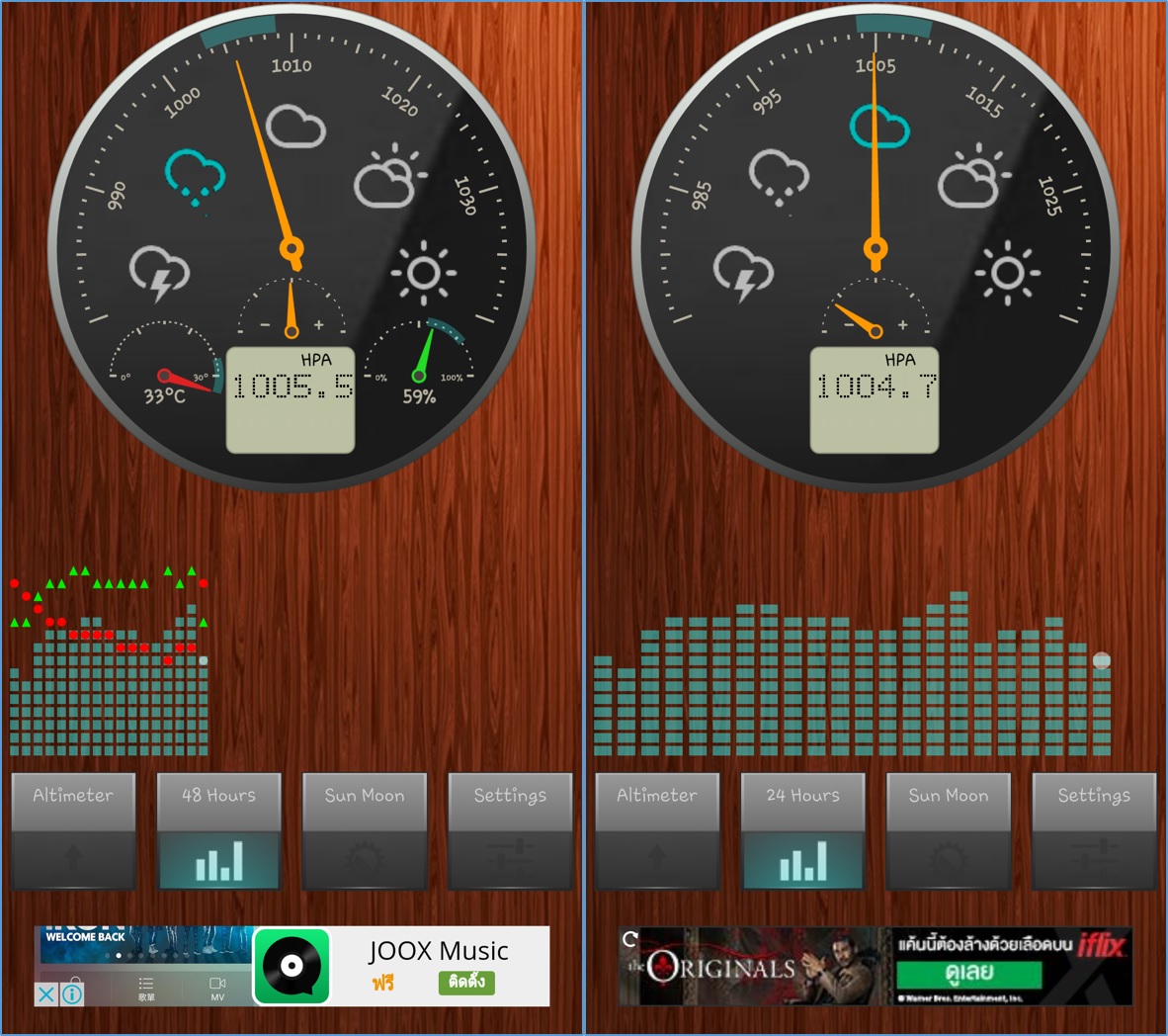 การใช้งานแอปตัวนี้ก็ง่ายๆ ครับ ด้านบนจะมีหน้าปัดที่พยากรณ์ว่าใน 1-2 ชั่วโมงข้างหน้าสภาพอากาศจะเป็นอย่างไร อย่างในภาพซ้าย แอปบอกกับเราว่าอาจจะมีฝนตก หรืออย่างในภาพขวา แอปบอกเราว่าท้องฟ้าจะมีเมฆครึ้ม และใต้หน้าปัดยังมีตัวเลขแสดงค่าความกดอากาศแบบเรียลไทม์ด้วย อย่างในภาพซ้ายระดับความกดอากาศอยู่ที่ 1005.5 HPA (หน่วย Hectopascal เฮกโตปาสคาล)