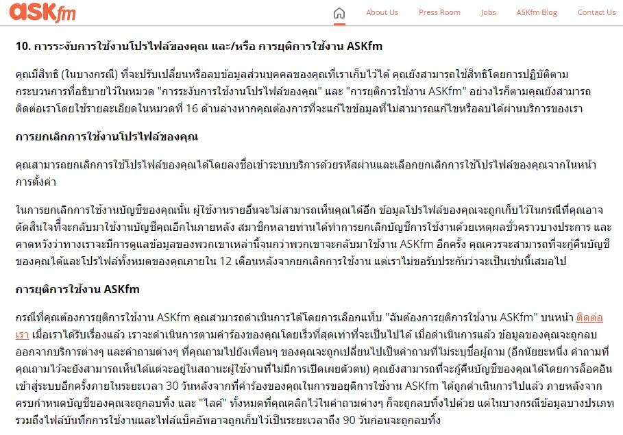 แต่ถ้าเรามีหลายบริการ แนะนำบริการ justdelete.me เป็น directory ของ direct links กดเข้าไปยกเลิกบัญชัได้ ช่วยย่นเวลาหาเมนูเพื่อเข้าไปลบบัญชี เข้าผ่าน Browser ที่ https://justdelete.me แต่เท่าที่ลอง บางบริการก็เข้าไปไม่เจอหน้ายกเลิก เพราะ Link เปลี่ยน ต้องค้นเองอีกที เว็บไซต์นี้เป็นเพียงหน้า Directory ที่เป็นตัวกลาง พอกดก็จะเข้าไปถึงหน้า Delete Account ของแต่ละบริการได้เลย สะดวกดีครับ ลองกดเข้าไปสักอัน ยกตัวอย่าง บริการ Ask.fm เรื่องระงับการใช้งาน ยกเลิกการใช้งาน