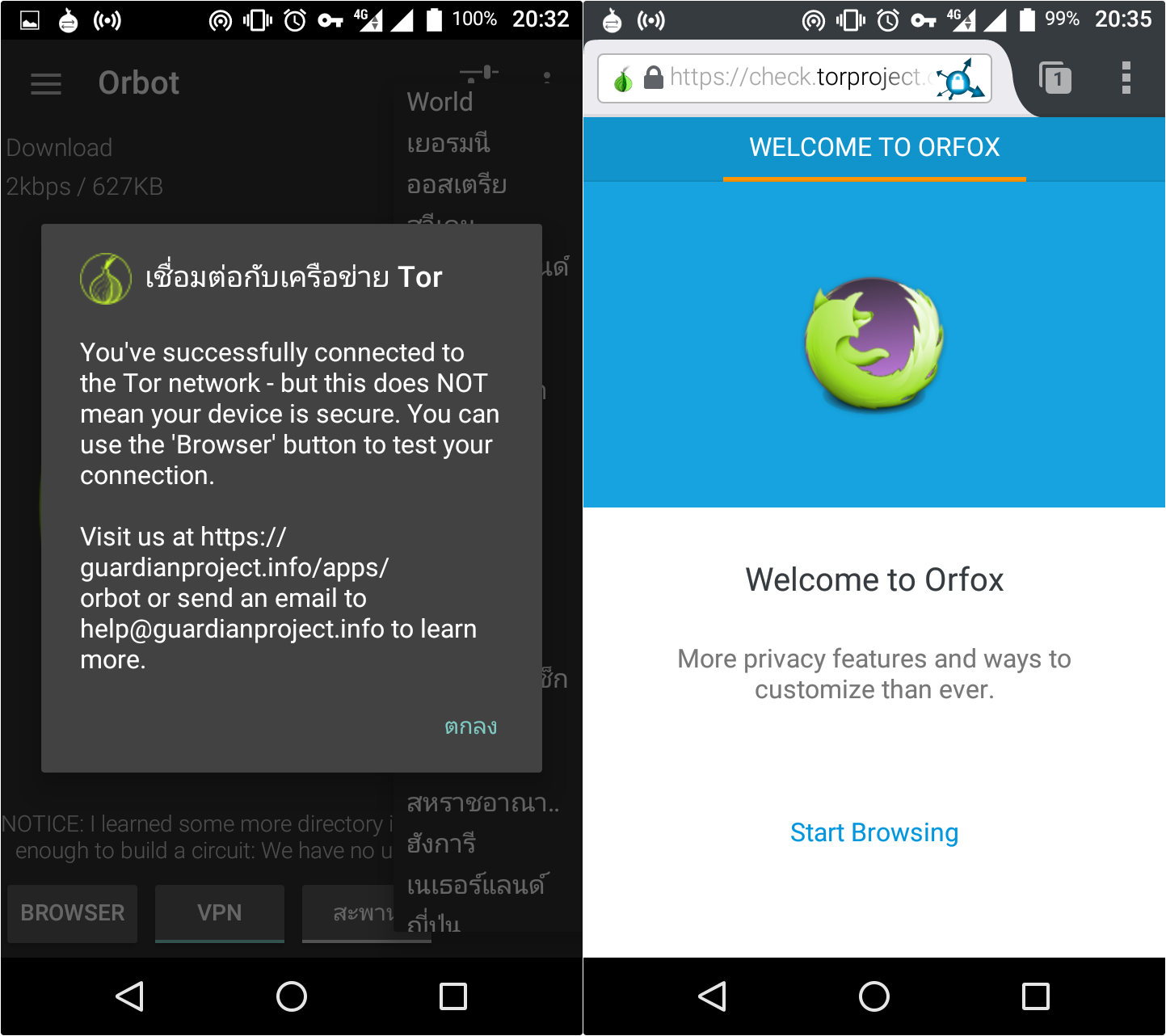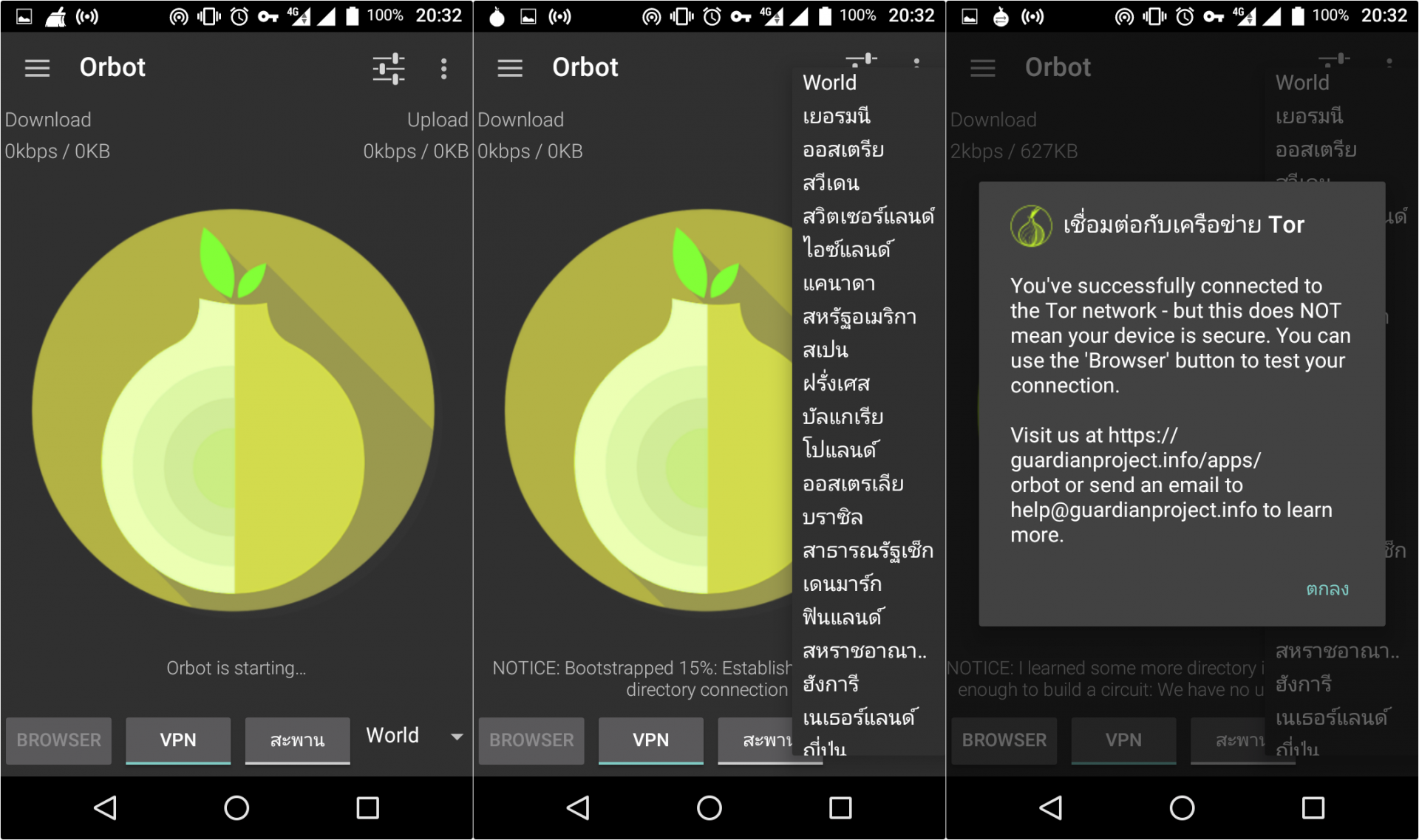 บนมือถือจะเป็น Tor for Android ใช้งานได้บนมือถือ Android จริงๆใช้ได้บนคอม Windows, Mac บนมือถือจะเป็น Proxy with Tor ของ Orbot เป็นบริการ Free proxy ที่ทำให้เราใช้เน็ตได้อย่างปลอดภัย โดย Tor จะเข้ารหัสการใช้เน็ตของเรา หรือจะโหลด apk ก็ลองดูในเว็บ คนที่ใช้มือถือบางยี่ห้อ อ่านรายละเอียดที่ https://play.google.com/store/apps/details?id=org.torproject.android ส่วนใครที่อยากใช้บน Browser จะมี Tor Browser for Android เป็นช่วงทดลองใช้ ดาวน์โหลดฟรี https://play.google.com/store/apps/details?id=info.guardianproject.orfox