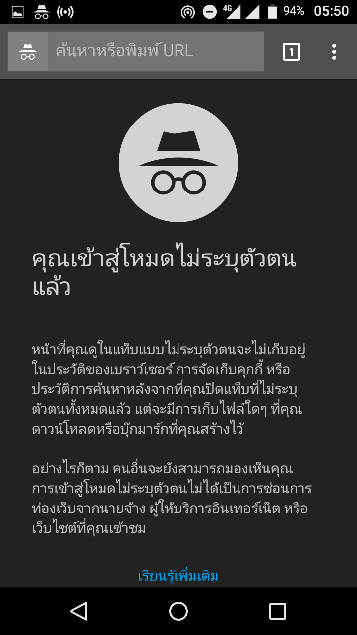 ตอนที่เราอยู่ในโหมดไม่ระบุตัวตน (Private Mode หรือ Incognito Mode) สังเกตมุมขวาจะมีหน้าตาคนใส่หมวกแบบนี้ ถ้าเป็นบนมือถือ ใช้ Google Chrome ก็จะเห็น โลโก้ ใส่หมวกกับแว่นตาดำ เมื่อเปิดหน้าต่างใหม่ Incognito Mode จะมีหน้าตาแบบนี้
