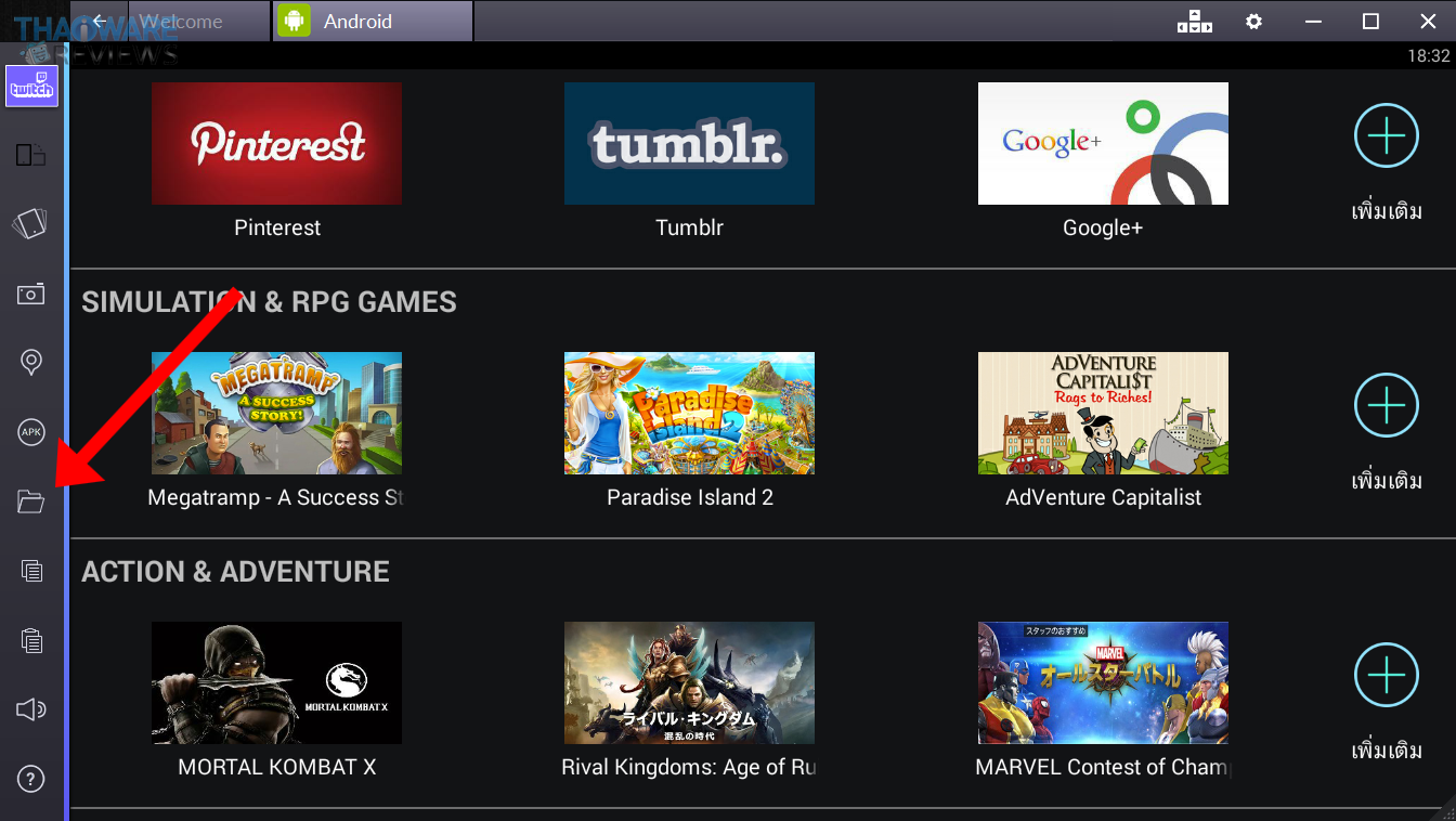 4. คลิกไปที่ไอคอนรูป "โฟลเดอร์" ที่ด้านซ้ายมือ แล้วเลือกเปิด FakeGPS มันจะทำการคัดลอกไฟล์ไปไว้ยังโฟลเดอร์ของ BlueStacks ให้เราอัตโนมัติ