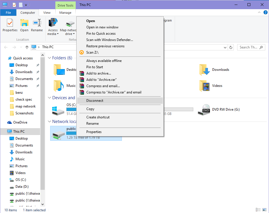ถ้าเราไม่ได้เอาไดรฟ์ที่เราทำไว้ออกตัวไดรฟ์ก็จะอยู่แบบนั้น ไม่หายไปไหน หากต้องการจะเอาไดรฟ์ที่เราได้ Map Network Drive ออกก็ง่ายๆ เลยครับให้คลิกขวาแล้วกด Disconnect ได้เลย แล้วไดรฟ์ที่สร้างเอาไว้ก็จะหายไปแล้ว