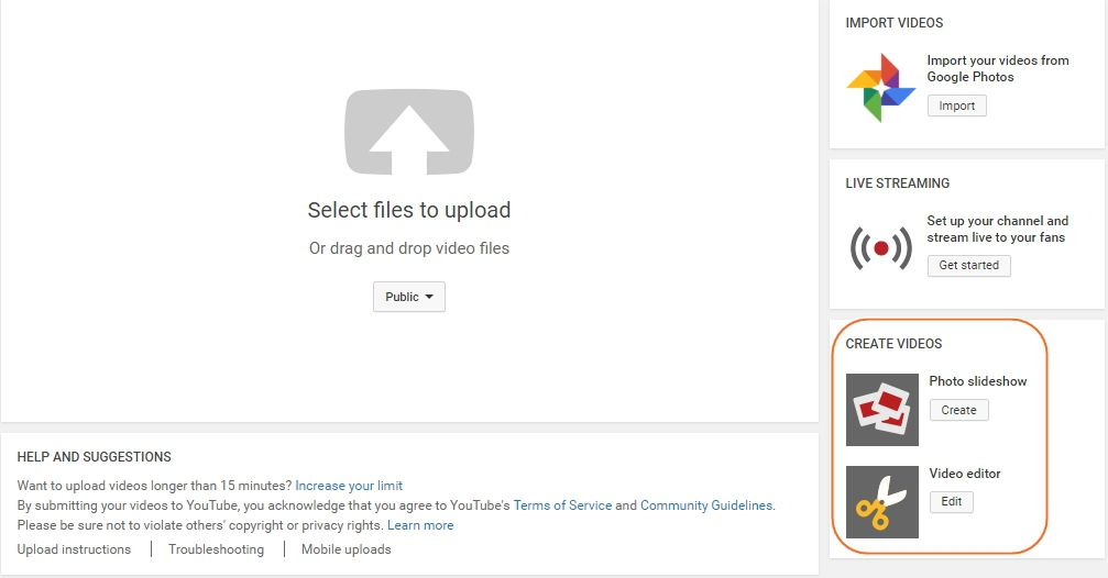 เมื่อเรากดปุ่ม Upload บนหน้า Browser บนคอมพิวเตอร์ มุมขวาล่างเราจะเห็นเมนู Create Videos กับ 2 คุณสมบัติแก้ไขวิดีโอ (Video Editor) และสร้างสไลด์โชว์อย่างง่าย (Photo Slideshow)