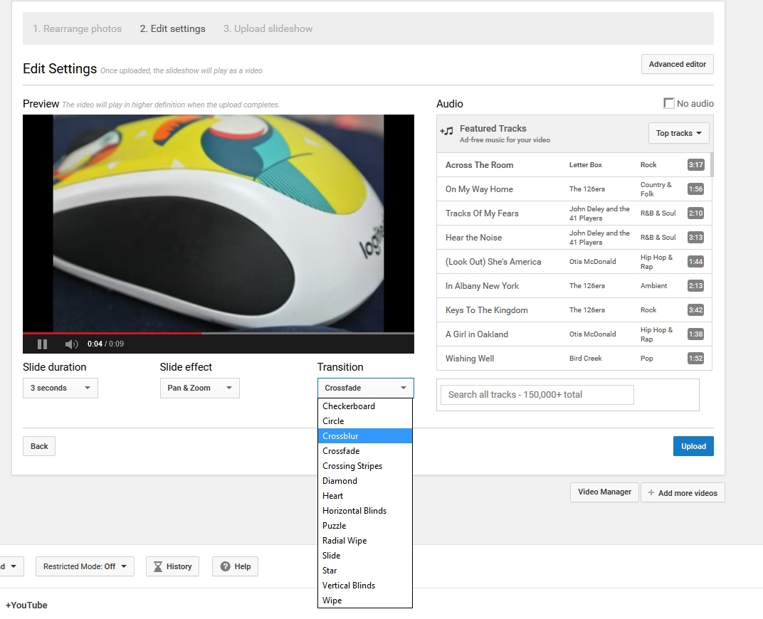 เมื่อเพิ่มภาพนิ่งแล้ว จะให้เรากำหนดเวลาในการเปลี่ยนภาพ ถ้ามีภาพเยอะก็ไวหน่อย ใส่เพลง (ไม่มีปัญหาเรื่องลิขสิทธิ์แน่นอน) เลือก Transition หรือรูปแบบ เอ็ฟเฟ็กต์ในการเปลี่ยนภาพ