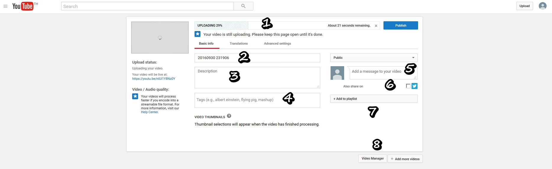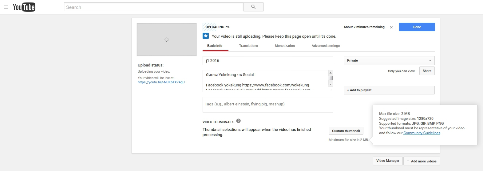 ถ้าต้องการอัพโหลดภาพขนาดย่อ หรือ Video thumbnail แนะนำให้อ่านหัวข้อด้านบน