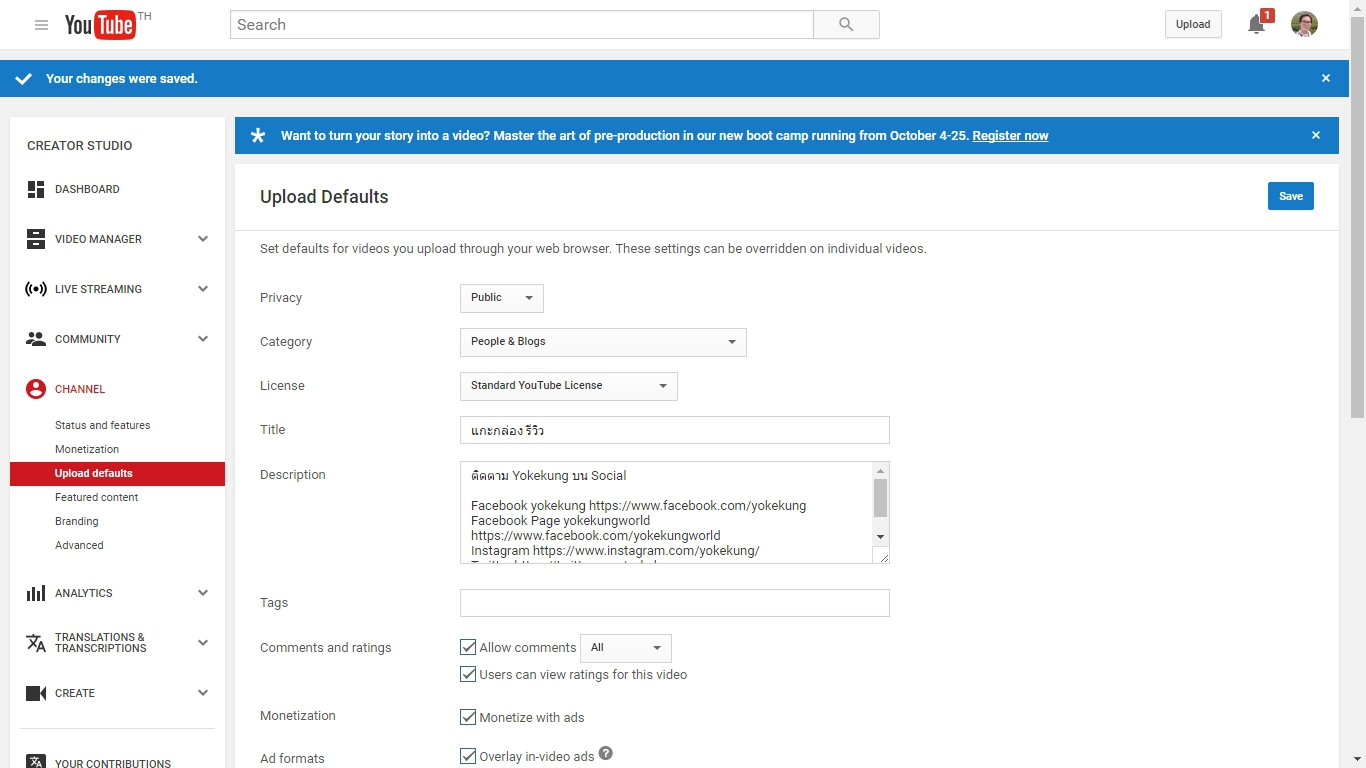 เราสามารถกำหนดค่าเริ่มต้นในการ Upload วิดีโอได้ โดยกำหนดให้ทุกคลิป มีข้อความพื้นฐานในคลิป เช่น ป้อนข้อความ ชื่อร้าน สโลแกนร้าน ใส่ Facebook Instagram Twitter ช่องทางติดต่อของเรา Link เพิ่มเติม เว็บไซต์ของเรา กำหนด Privacy หลัก กำหนด Category อยากให้ Title วิดีโอเป็นอะไร โดยที่เราไม่ต้องพิมพ์ใหม่ทุกครั้ง เช่น แกะกล่อง เล่าเรื่อง หรือถ้าทำรายการทีวี ก็ใช้ชื่อรายการนำ แล้วต่อด้วย EP xx ตามที่เราต้องการ เลือกให้แสดง comment หรือปิด comment หรือกำหนดว่าจะต้อง approve comment ก่อนถึงจะแสดงใต้คลิปได้ ถ้าใช้เบราว์เซอร์บนคอมพิวเตอร์ เข้าไปตั้งค่าได้ที่ https://www.youtube.com/upload_defaults เราแนะนำการตั้งค่าพื้นฐานพวกนี้ ทำบนคอมก่อน แล้วการอัพโหลดวิดีโอ ใช้มือถือก็ได้ครับ