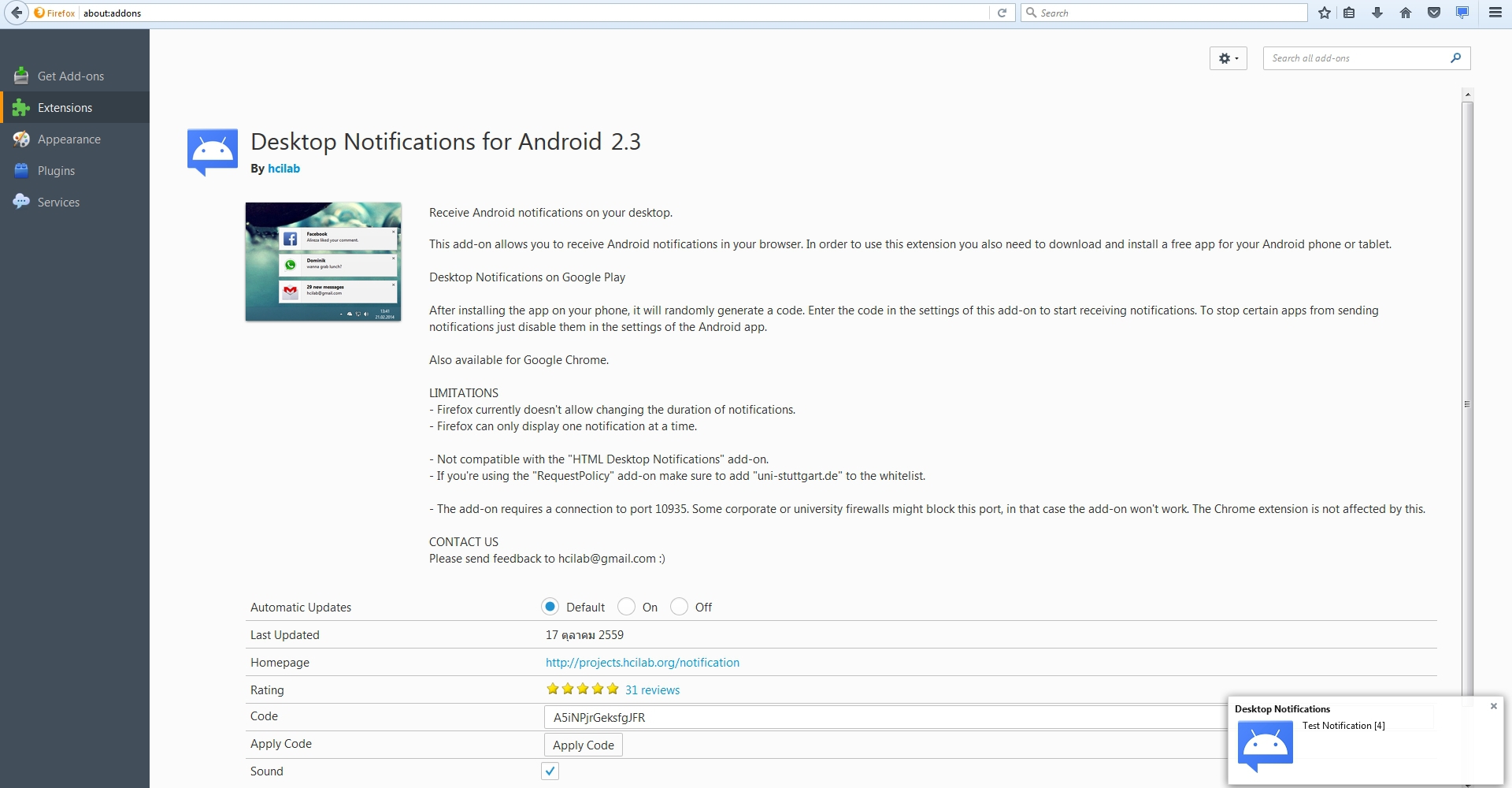 ตั้งค่า Notifications จากนั้นเชื่อมต่อกับบัญชี Google แล้วเราจะได้โค้ด ให้นำ Code นี้ไปใส่บน Firefox หรือ Chrome เพื่อผูกการแจ้งเตือน Desktop Notificationsfor Android จะทำงานก็ต่อเมื่อเราใช้งาน Browser Chrome และ Firefox บนคอมพิวเตอร์ดังภาพ