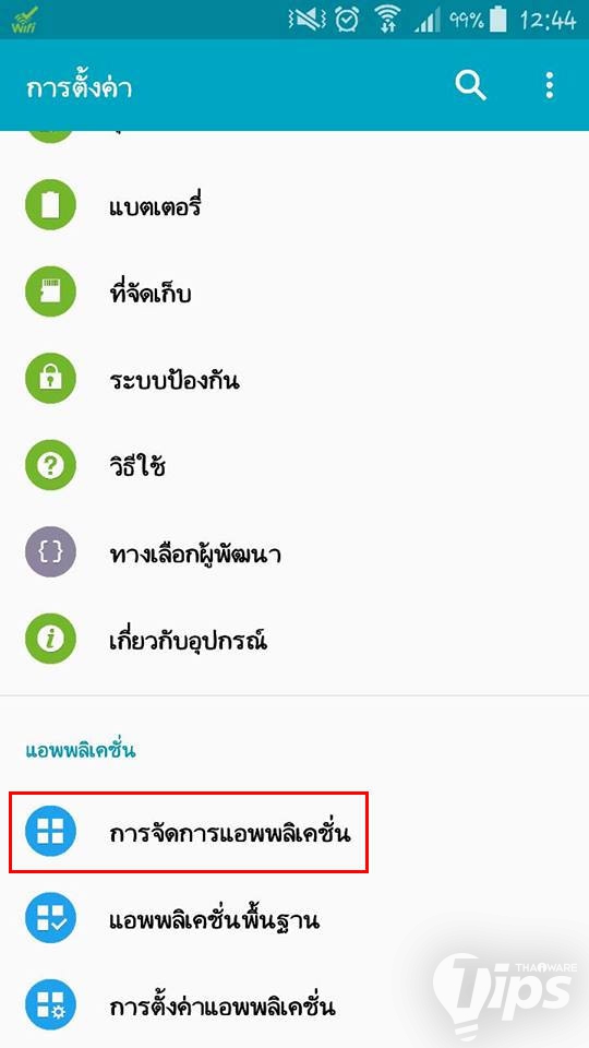 1. ขั้นตอนแรก ให้เข้าไปที่ การตั้งค่า เลือก การจัดการแอปพลิเคชัน