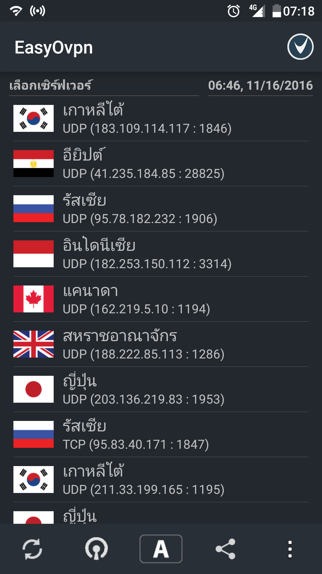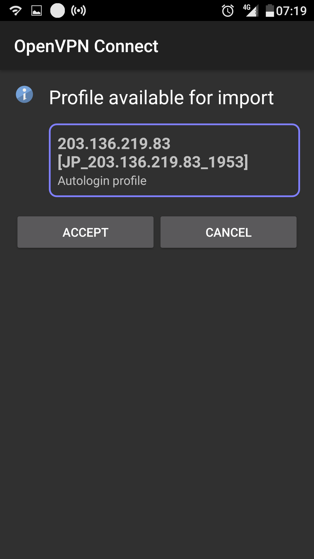 เมื่อเปิดแอป หน้าจอแรกจะมีเซิร์ฟเวอร์ประเทศต่างๆให้เราเลือก ตัวอย่าง เลือกเซิร์ฟเวอร์ญี่ปุ่น แอปจะทำการ Import Profile ของเซิร์ฟเวอร์ JP มาเก็บไว้