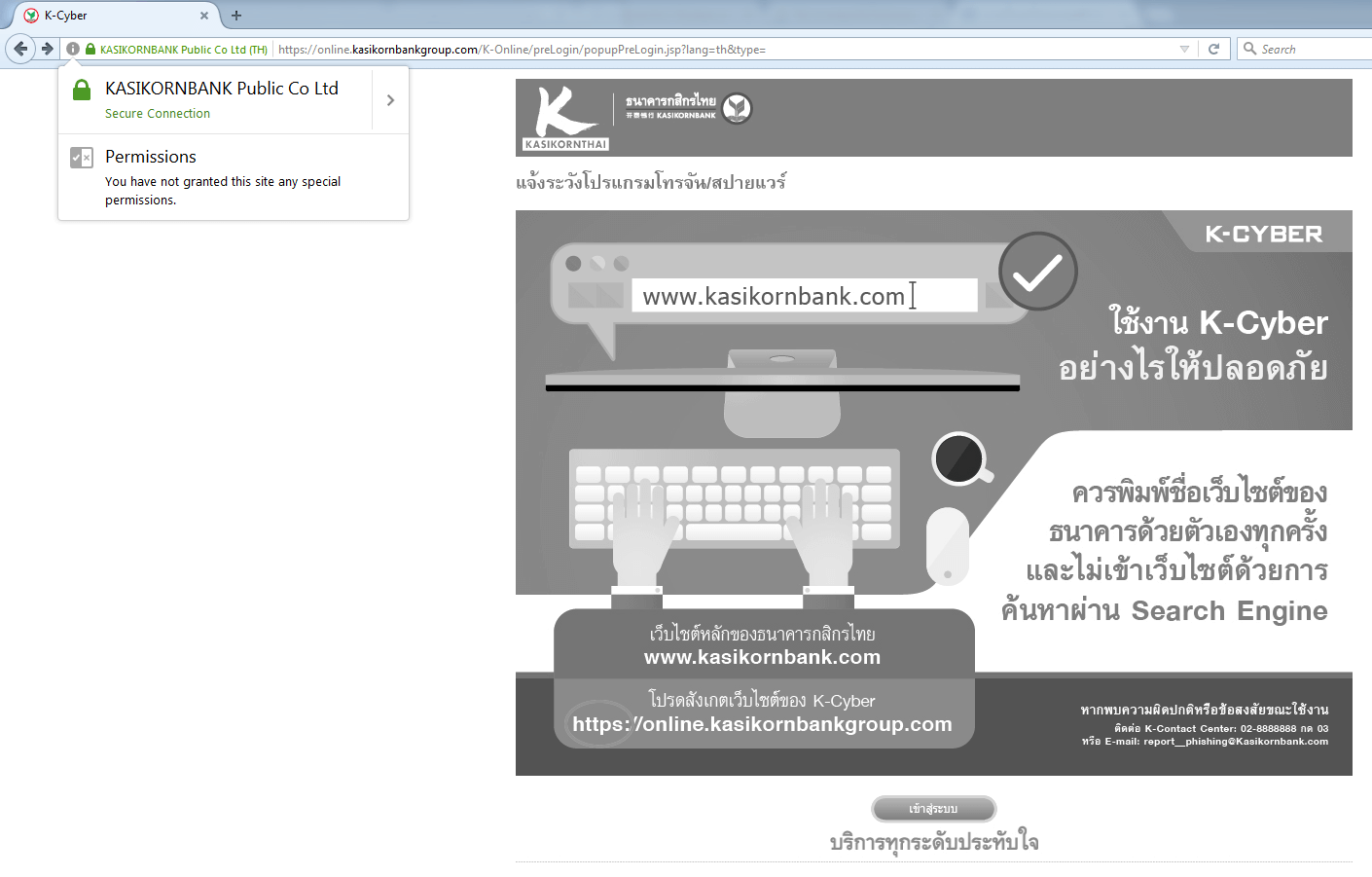 ยกตัวอย่างเว็บไซต์ธนาคาร จะมี https และสีเขียวบนแถบ Address Bar ที่ป้อน URL