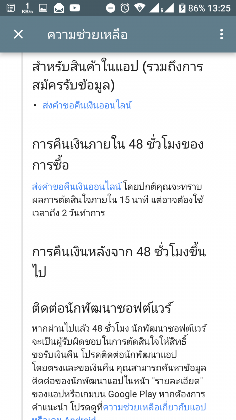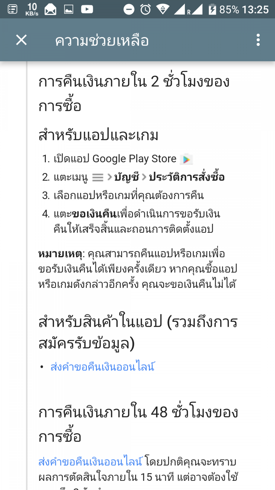 หากเกินจาก 2 ชั่วโมง แต่ไม่ถึง 48 ชั่วโมง จะต้องยื่นขอเงินคืนจากอีกเมนูนึงคือ "ความช่วยเหลือและความคิดเห็น (Help & Feedback)" จากนั้นเข้าไปที่ หัวข้อ "จัดการแอปของคุณ" จะมีส่วนของ "การคืนผลิตภัณฑ์และการคืนเงินใน Google Play" ยื่นแบบฟอร์มจากส่วนนี้ เพื่อขอเงินคืน