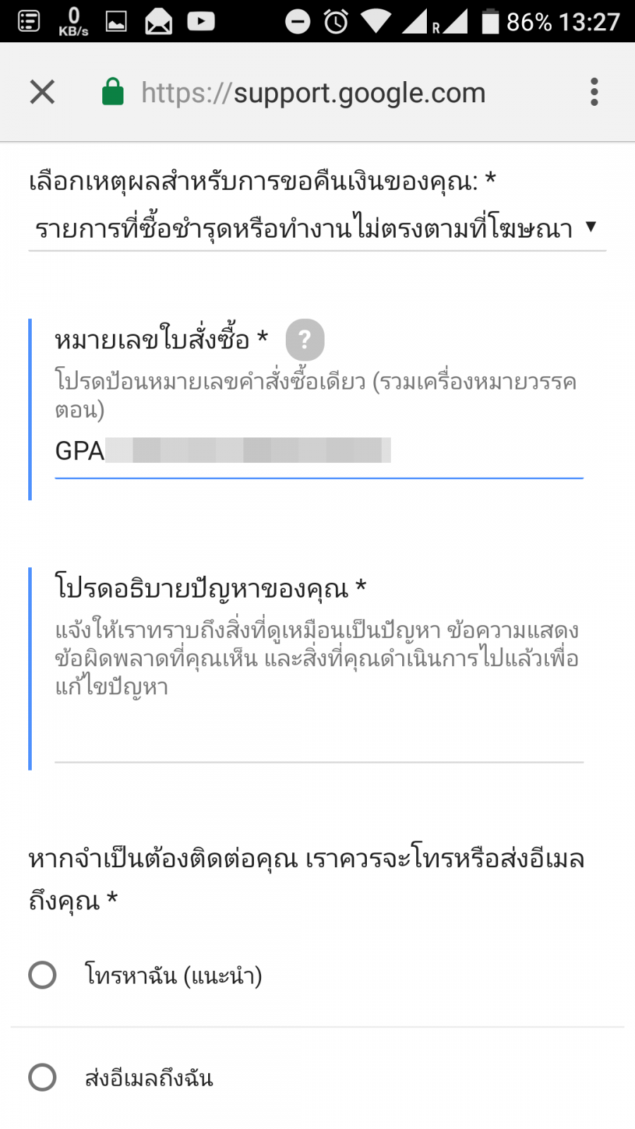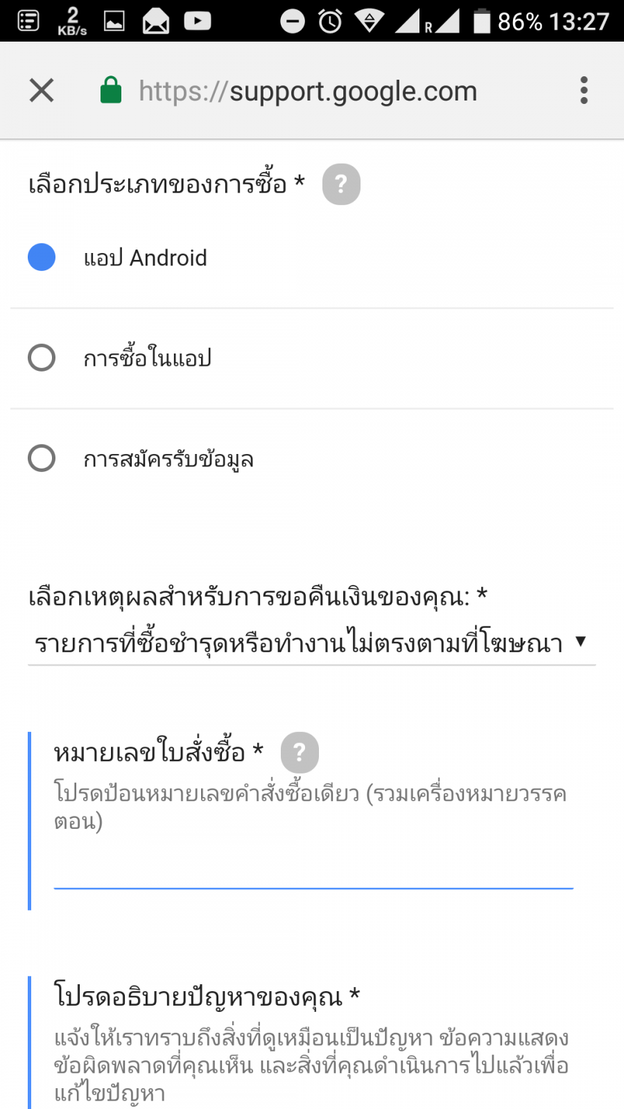 การกรอกยื่นขอเงินคืน จะต้องใช้ เลขที่ใบสั่งซื้อ จากอีเมลที่ส่งมาให้เราตอนที่กดซื้อแอปพลิเคชัน ผมซื้อแอปฯ ช่วง 9 โมงกว่า แต่ขอเงินคืนบ่ายโมงกว่า เลยระยะเวลา 2 ชั่วโมงแรกไปแล้ว แต่ยังอยู่ใน 48 ชั่วโมง