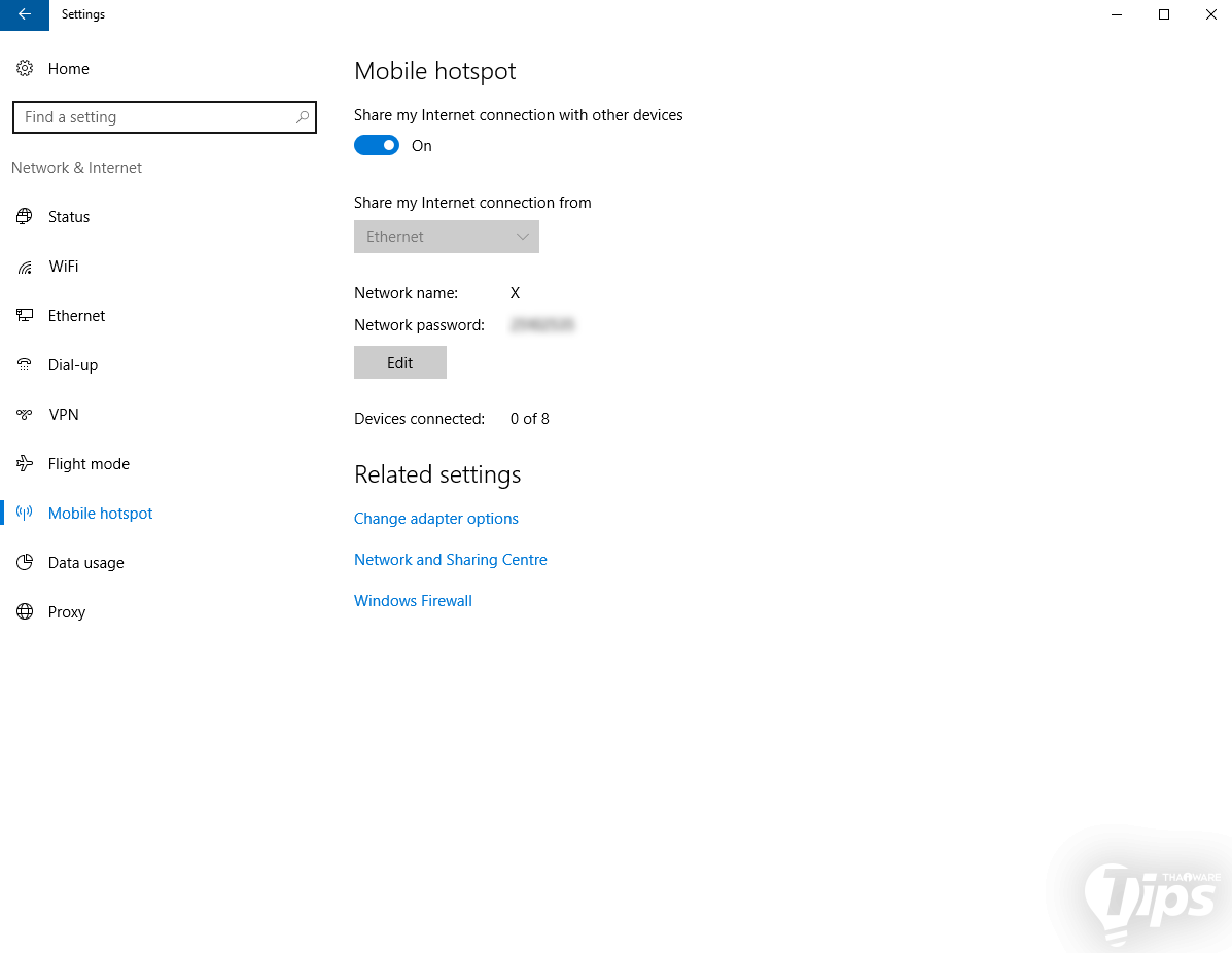 ขั้นที่ 2 เลือกหัวข้อ Mobile hotspot (คลิกที่ Edit เพื่อแก้ไขชื่อ และรหัสเชื่อมต่อ)