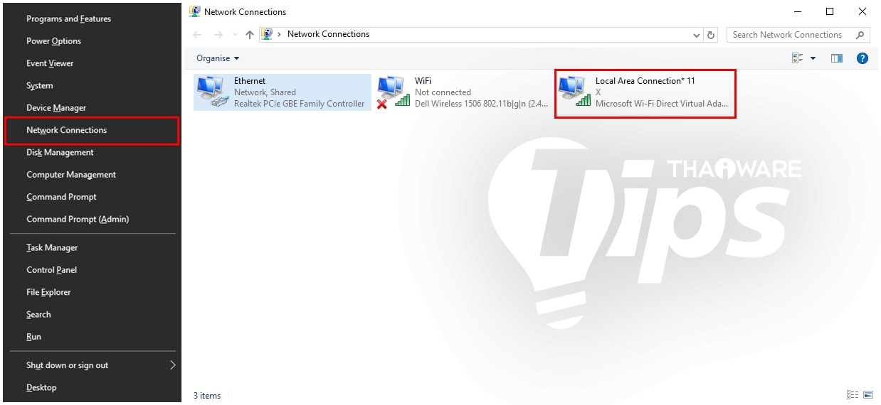 ขั้นที่ 4 เข้าไปที่ Network Connections (คีย์ลัด กด Windows + X) คุณจะพบกับ Local Area Connection ที่ถูกสร้างขึ้นมาใหม่