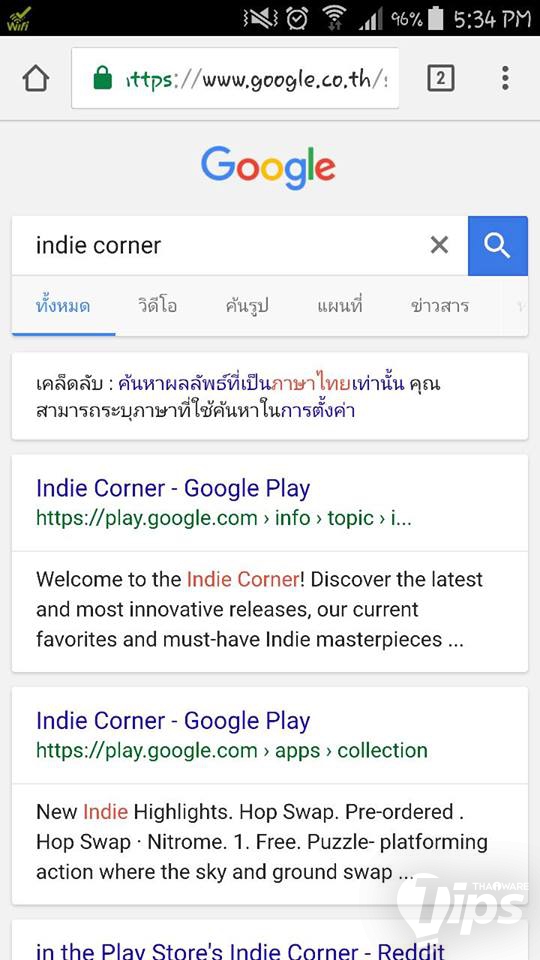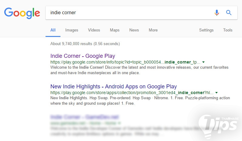 จะนั่งไล่จากหน้าแรก หรือเข้าไปดูใน All Categories ก็ไม่เจอ ซึ่งจริงๆ แล้ว วิธีเข้าไปในหมวดนี้ ง่ายนิดเดียวครับ เพียงไปที่เบราว์เซอร์บนมือถือ แล้วค้นหาคำว่า 'Indie Corner' ก็จะพบลิ้งของ Indie Corner ที่ตรงมายัง Google Play Store นั่นเอง โดยวิธีนี้ จะใช้บนเบราว์เซอร์ของคอมพิวเตอร์ก็ได้นะครับ
