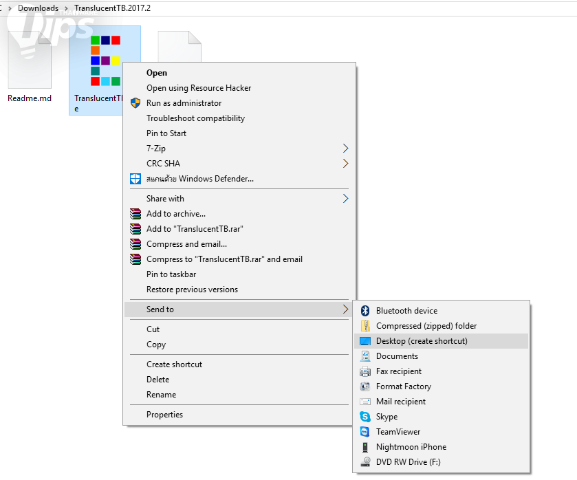 ให้เราคลิกขวาบนไฟล์ TranslucentTB.exe เพื่อ Create Shortcut ก่อน