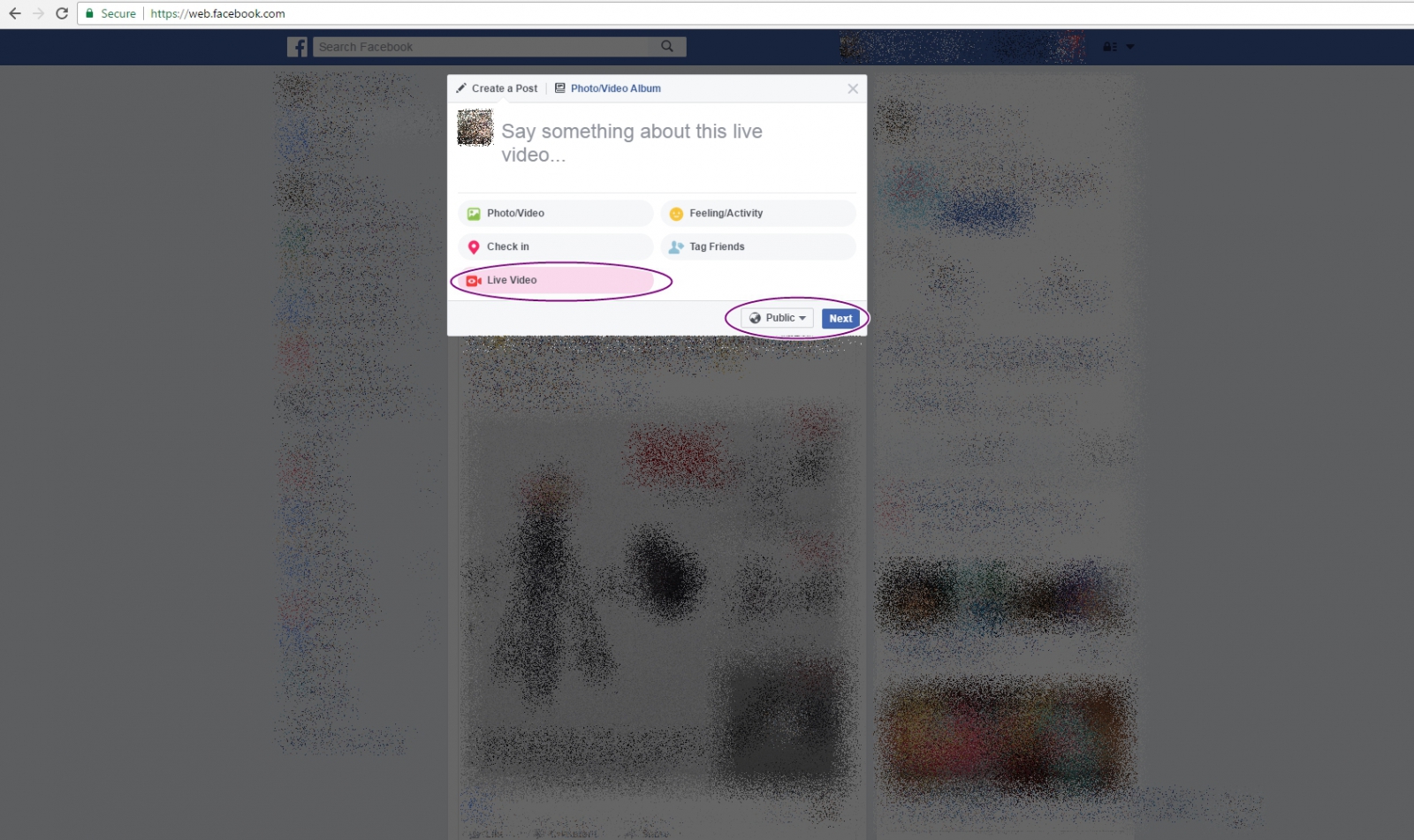 เมื่อเรากดที่ Live Video จะมีสีชมพูขึ้น จากนั้นเลือกว่าจะเปิด Live เป็น Public, Friends Only หรือ Privacy ที่เราต้องการ จากนั้นกด Next