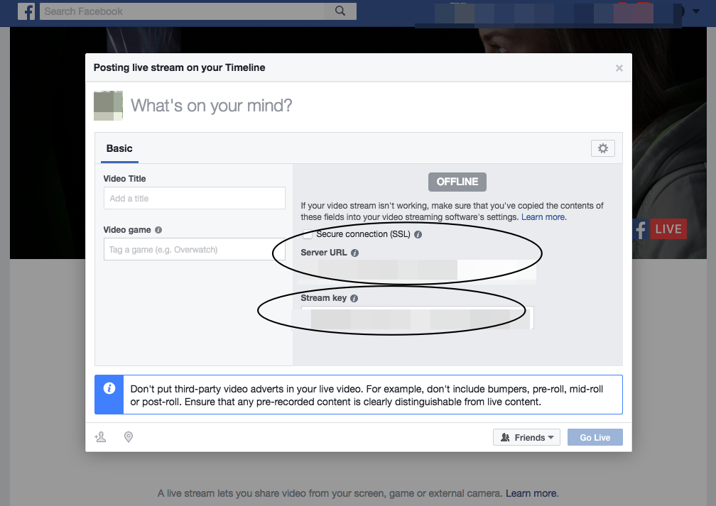 สำหรับการ Live ผ่าน OBS (และซอฟต์แวร์จัดการการออกอากาศสดทุกตัว) จำเป็นจะต้องมี Stream Key สำหรับถ่ายทอดสด (ถ้าเป็น XSplit สามารถ Log in Facebook เลือกหน้าเพจที่เราจะสตรีมได้ทันที) ซึ่งสามารถขอได้โดยเข้าไปที่ https://www.facebook.com/live/create/ กดเลือก Create Live Stream จากนั้นจะมีหน้าต่างให้เลือก ว่าจะ Live ผ่าน Profile, Group, Pages โดยเรานำ Stream Key ตรงนี้ มาเตรียมไว้เพื่อกรอกใน OBS