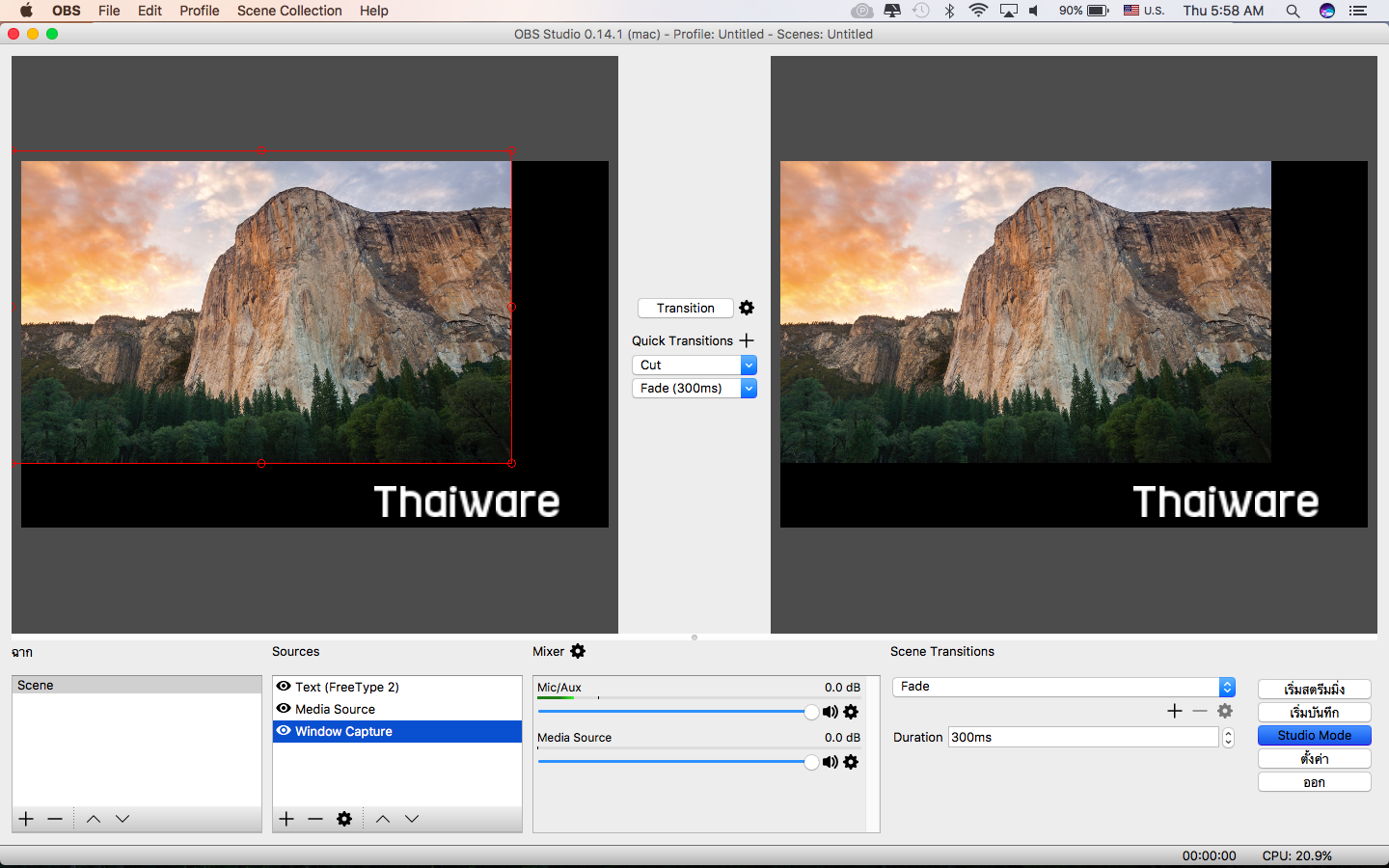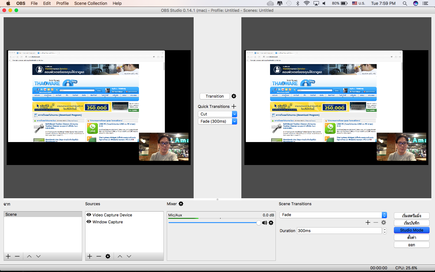 โดยมี 2 รุ่นคือ OBS Classic และ OBS Studio เราแนะนำ OBS Studio โดย Studio Mode หน้าตาดูโปร จอด้านซ้ายจะแสดง พรีวิว และจอด้านขวา จะแสดง Program หรือรายการถ่ายทอดสด