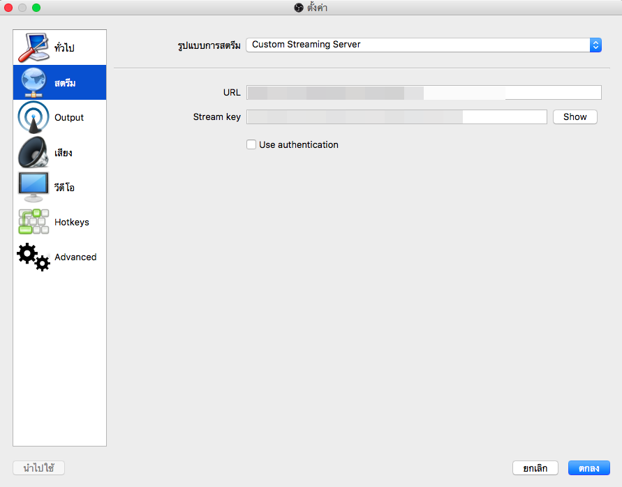 นำ Stream Key มากรอกใน OBS กดที่ "ตั้งค่า" -> สตรีม นำ Server และ Stream Key จากหน้าจอด้านบนมากรอกบน OBS เพื่อให้ OBS ส่งสัญญาณภาพหน้าจอและภาพจากกล้องเว็บแคม Live ได้